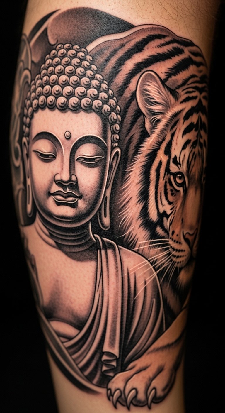 Add an animal, like a tiger, to Buddha for strength. It blends power with peace. Consider your thigh for space. Animal sketches in notebooks help plan. Wildlife decals provide quick trials. Look for artist specials under $130. Use pet-safe lotions nearby. This tattoo works for adventure seekers.