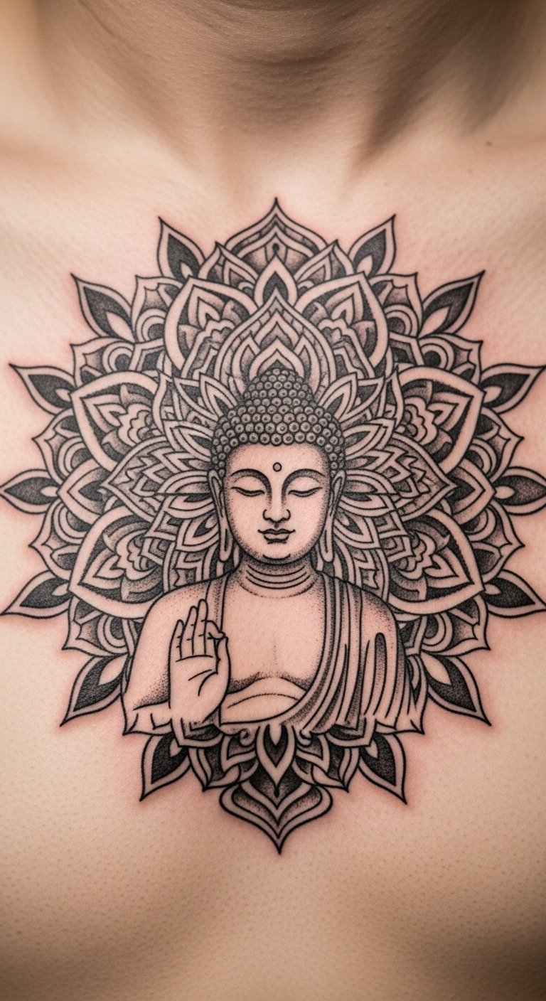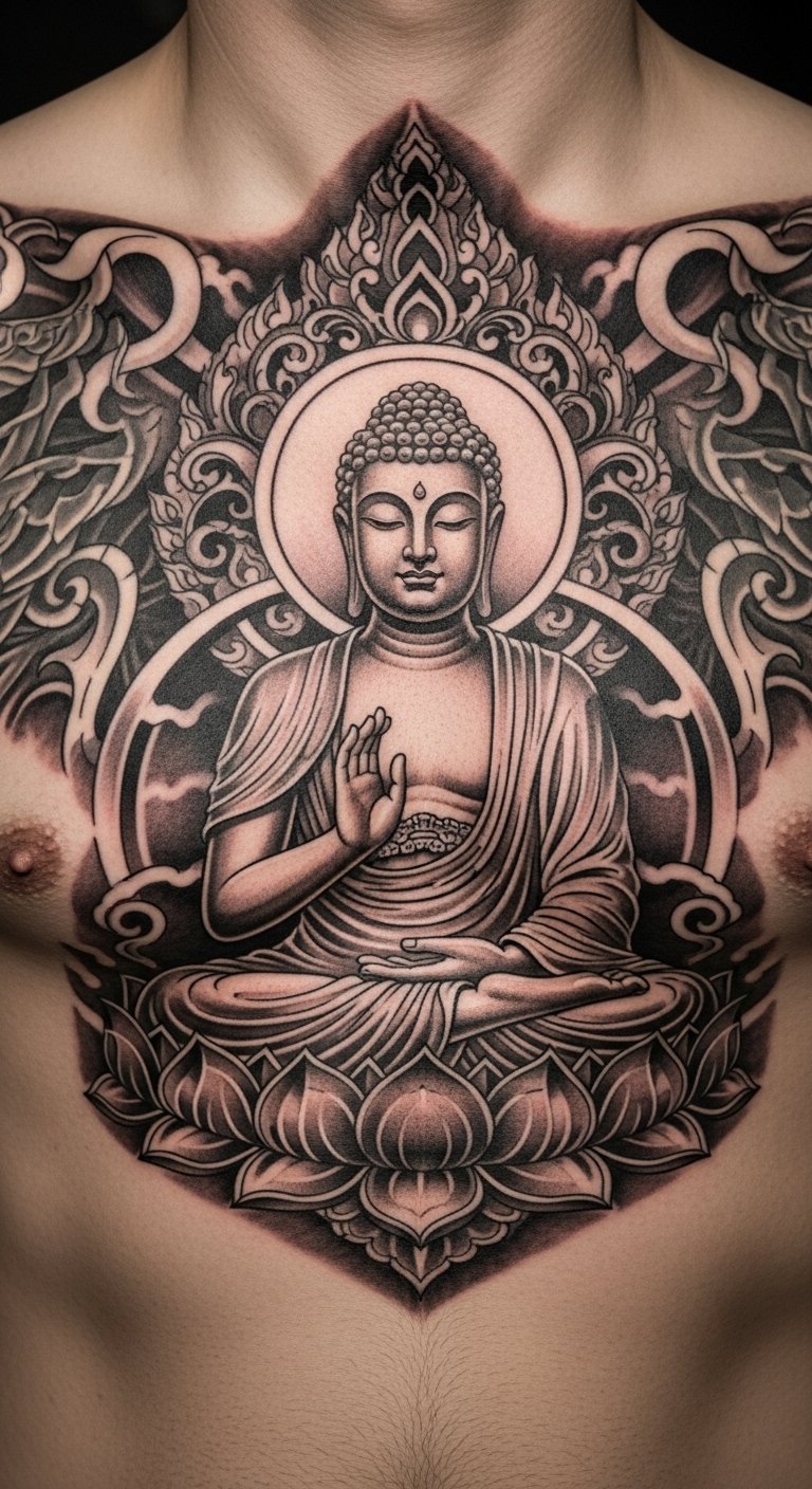 A full Buddha on your chest makes a grand piece. It covers the front fully. Chest offers prominence. Piece sketches guide. Piece temporaries help. Costs at $160. Care with clothing. This tattoo defines.