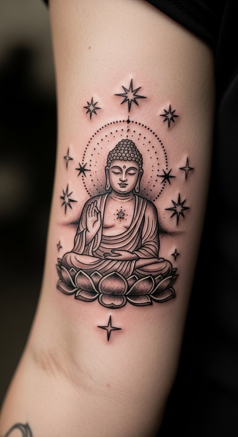 Make Buddha your own with added elements. Stars or dots personalize it. Arm provides visibility. Custom drawings on devices help. Personalized temporaries are available. Costs start at $100. Add step by step. This tattoo is for creative types.
