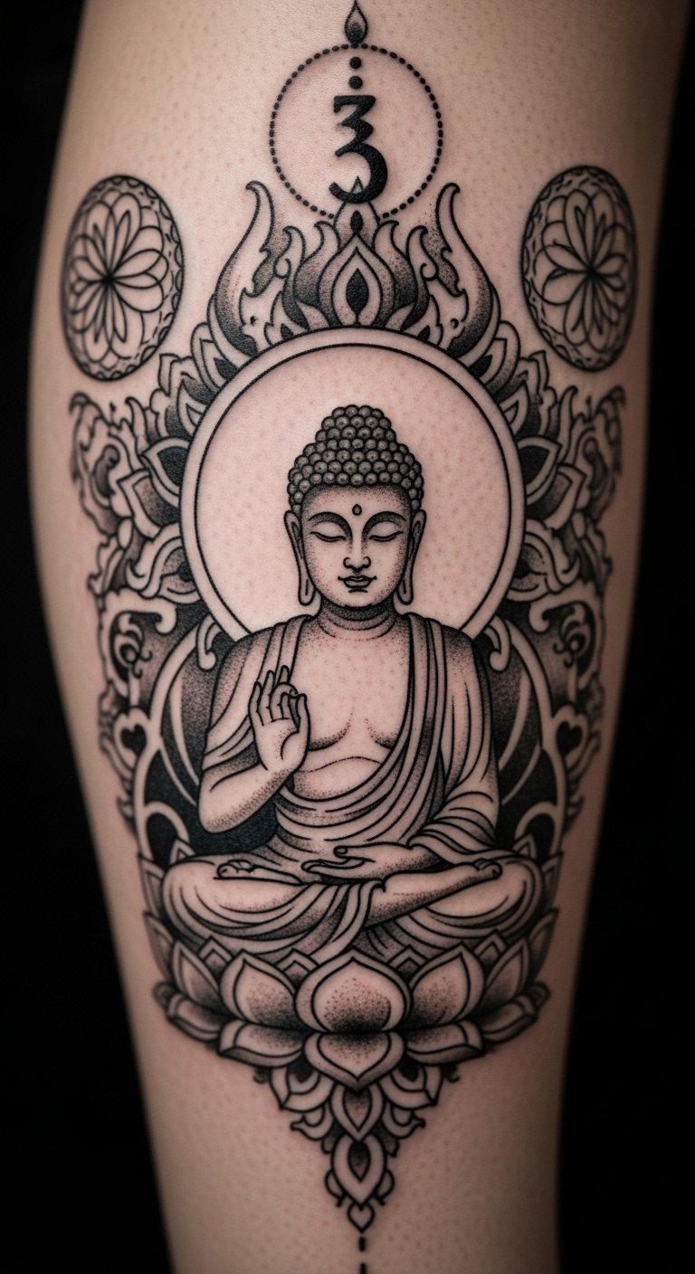 Incorporate symbols with Buddha for added depth. Circles enhance the theme. Leg gives room. Symbol charts guide you. Symbol stickers are budget-friendly. Sessions around $100. Integrate thoughtfully. This tattoo connects to symbolic minds.