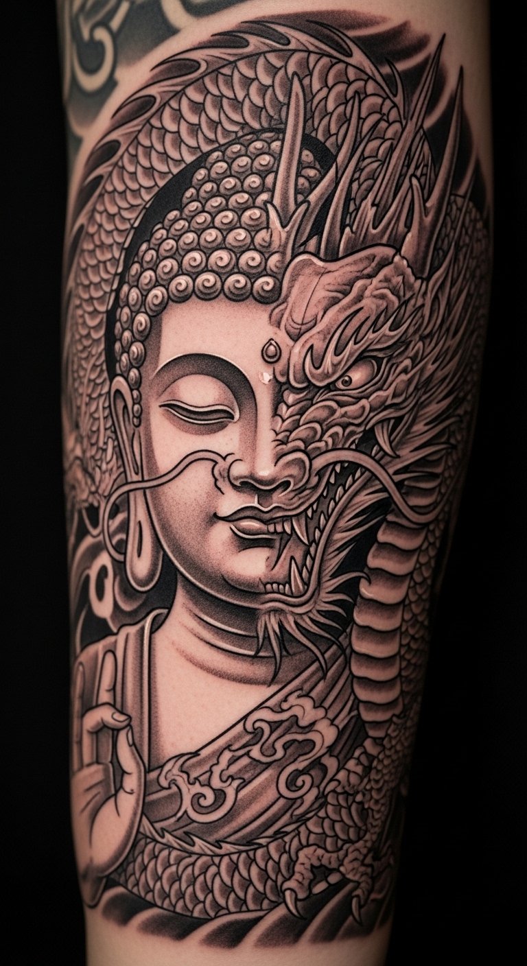 Blend Buddha with a dragon for power. The mix creates a dynamic look. Arm suits the flow. Dragon templates assist. Blended stickers exist. Prices around $130. Fuse ideas creatively. This tattoo energizes.