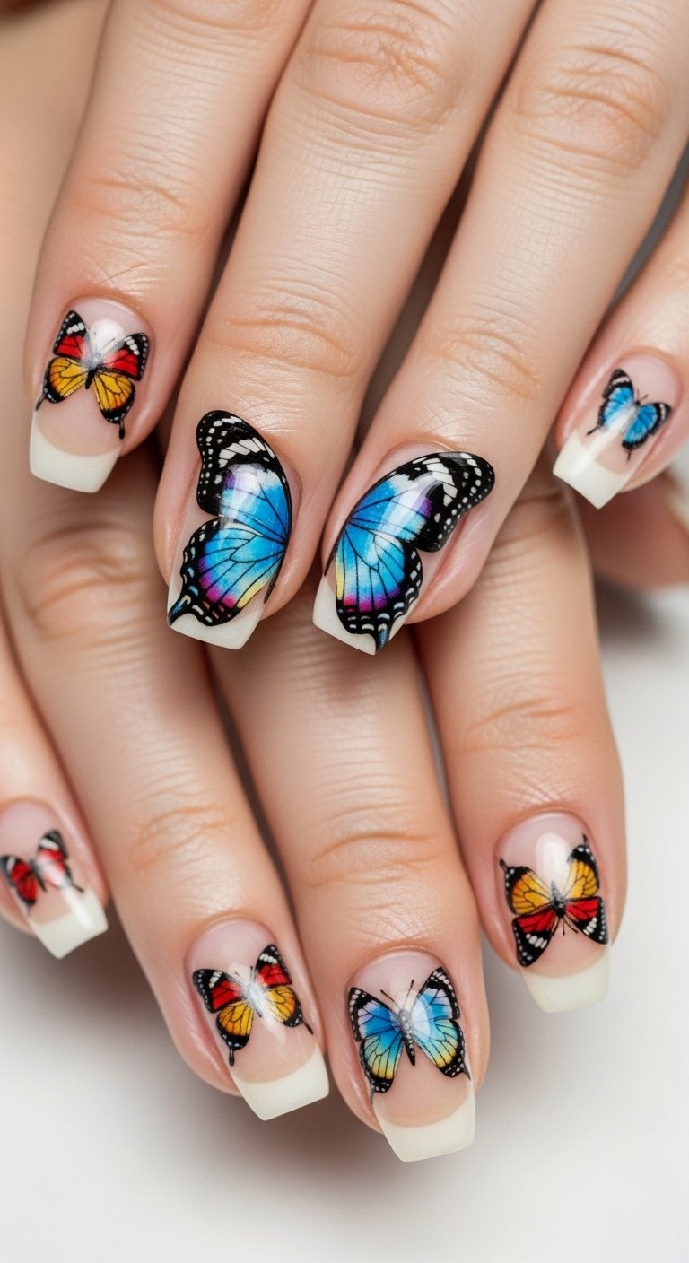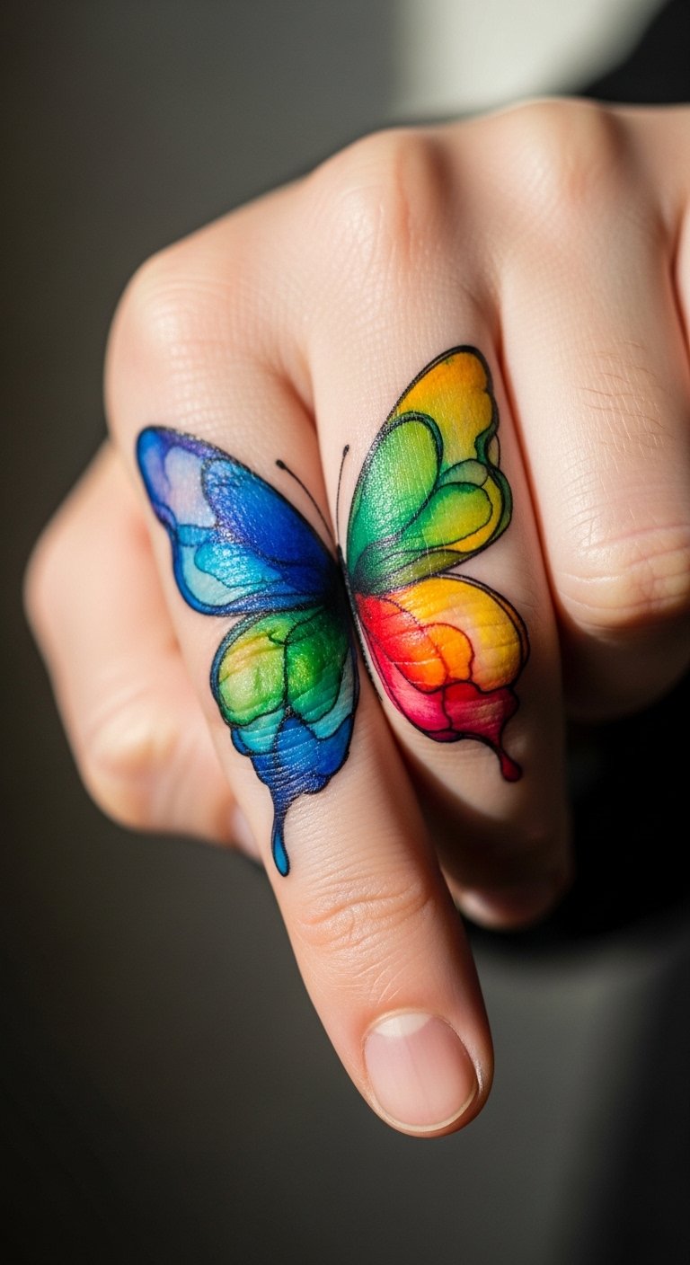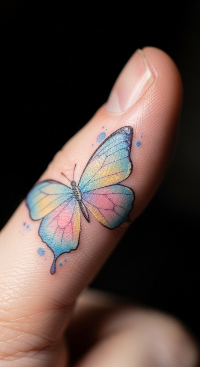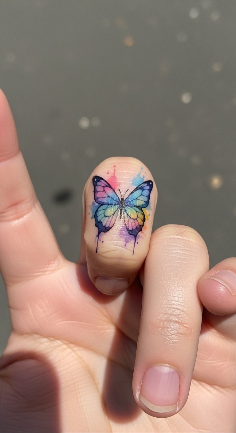 Vibrant Watercolor Butterfly on the Pinky Finger