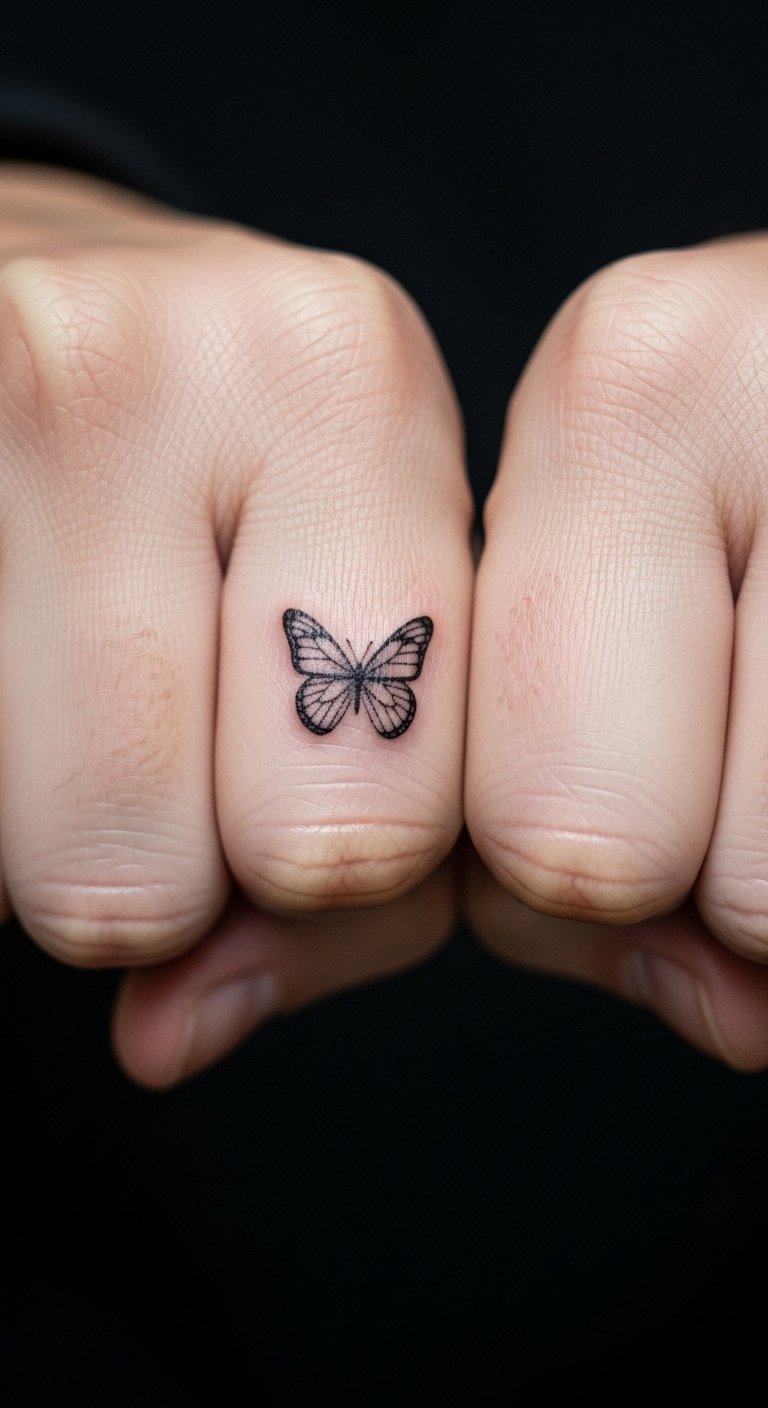 A hidden butterfly on the knuckle stays discreet, with subtle lines. Draw it out cheaply. Artists offer hidden spots. Use basics. Test it. Hide it well. Add flair.