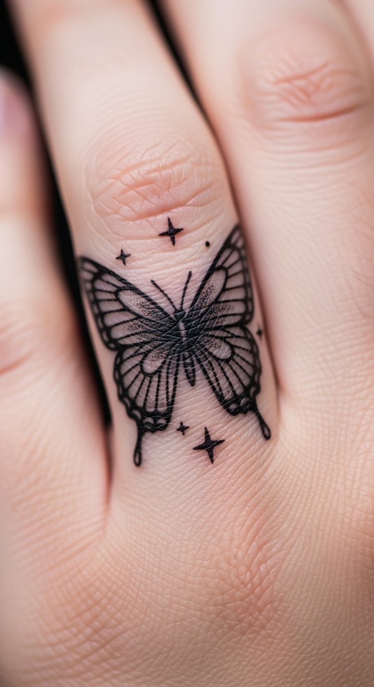 Stars around a butterfly on your ring finger add a cosmic touch, all in clean lines. This mixes elements easily. Sketch stars with what you have. Look for combo deals. Keep it simple. Plan on paper. Place thoughtfully. Customize with stars. Affordable options abound.
