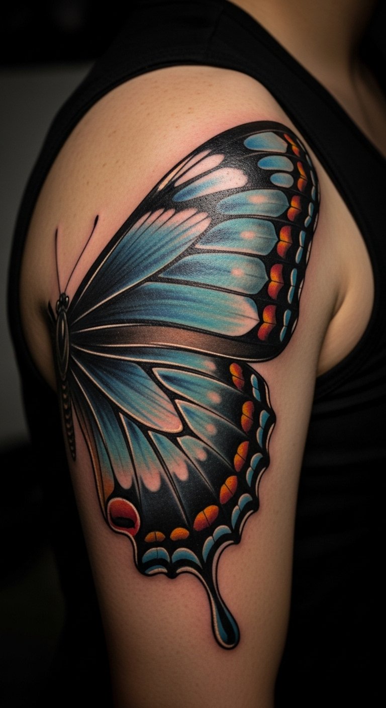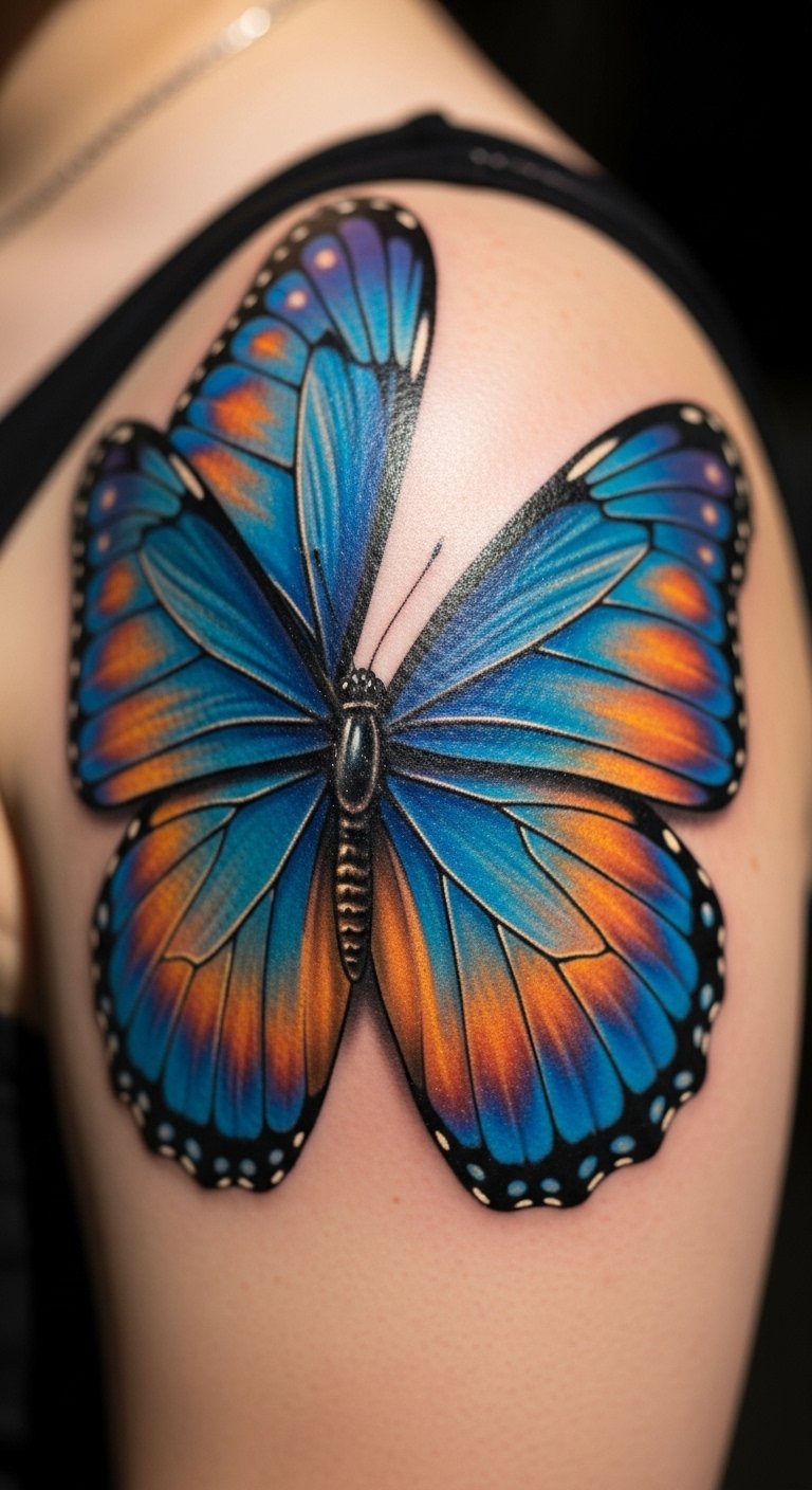 Large bold shoulder butterfly tattoos make a statement. Choose big sizes. Sketch grandly. Use bold lines. Place prominently. This stands out. Plan big.