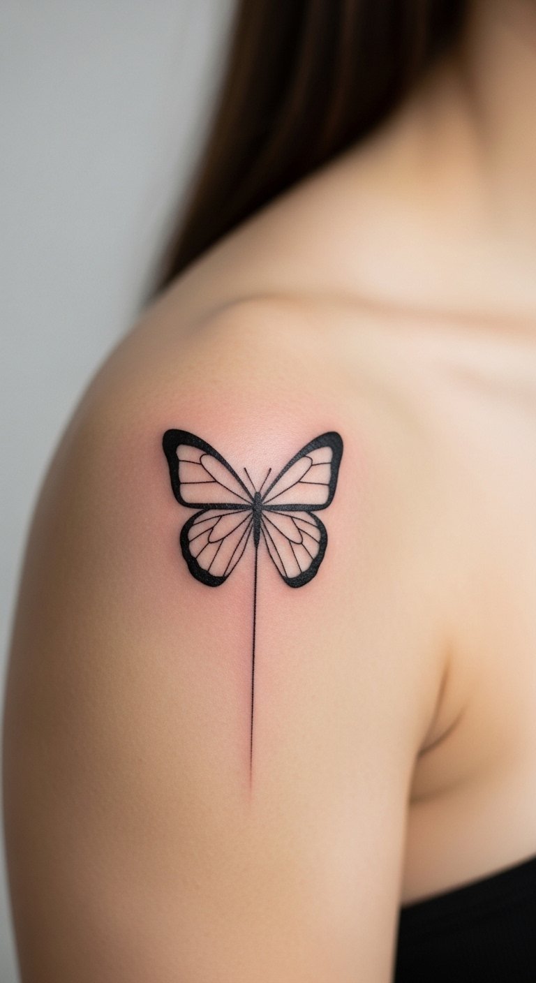 Minimalist butterfly tattoos keep things clean on your shoulder. Just a few lines create elegance. Sketch one yourself with a basic pencil. Use free templates online for guidance. Go with black ink to cut costs. Place it on the side for easy hiding. Find local artists who offer deals for simple work. Try drawing on your arm with a marker first. This style means personal growth without fuss. Keep it small for quick sessions. Add a dot or two for a twist.