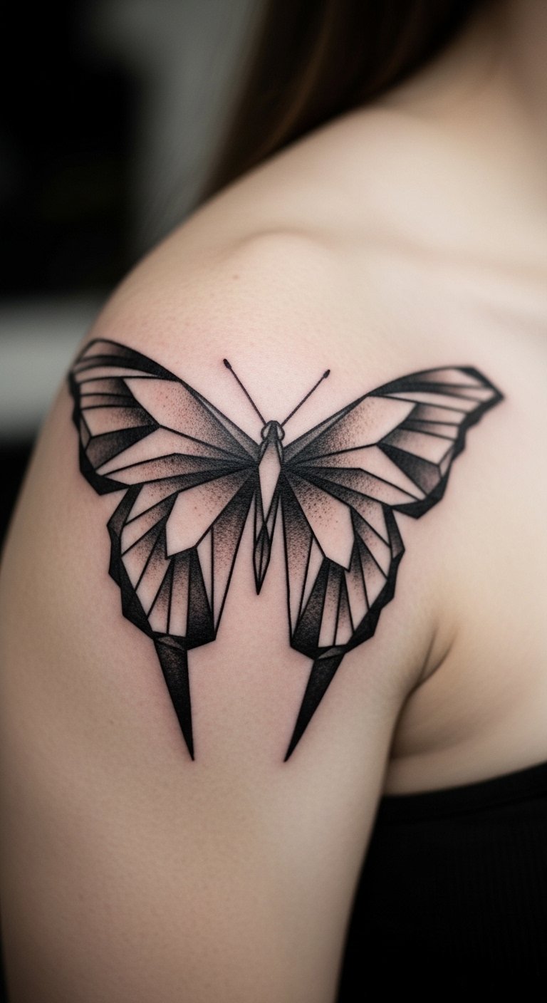 Geometric butterfly tattoos mix shapes for a modern shoulder look. Think triangles and squares forming wings. Draw grids at home with a ruler. Use affordable stencils from online sites. Stick to black lines for simplicity. Position it on the back for balance. Search for artists with portfolio deals. Experiment with paper cutouts before deciding. This design blends nature and symmetry. Opt for medium size to fit well. It represents resilience in a cool way.