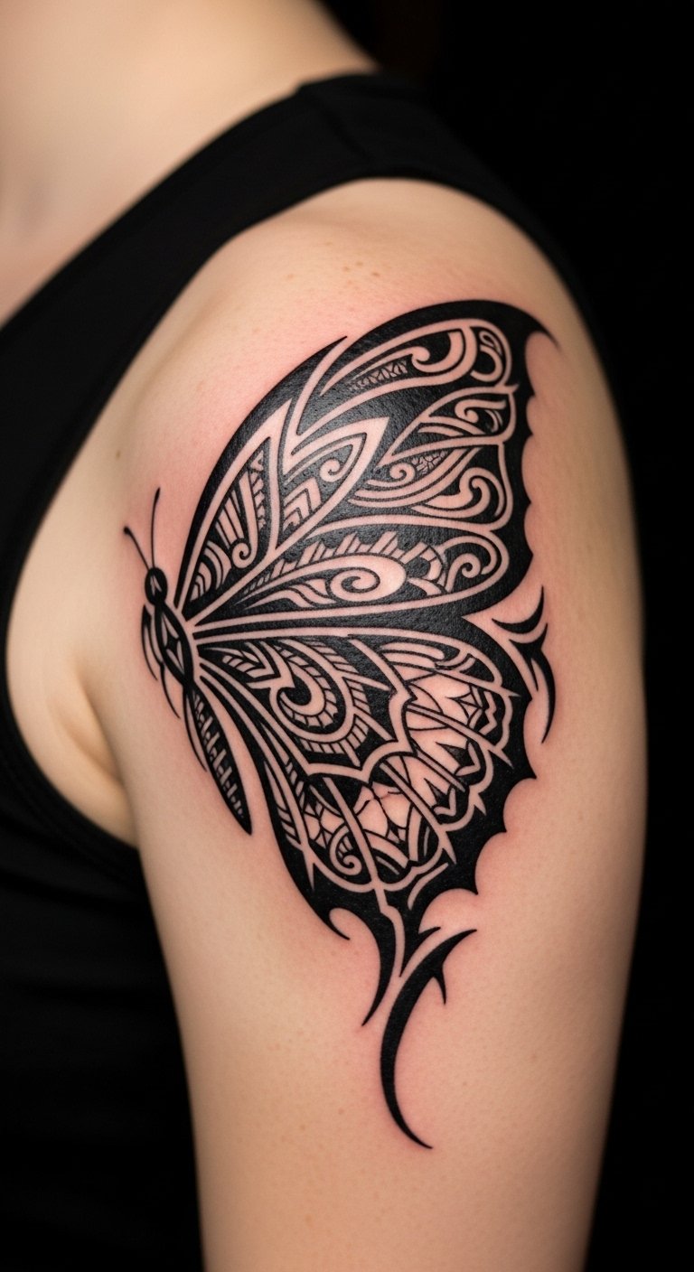 Tribal butterfly tattoos add bold patterns to your shoulder. They draw from cultural roots for depth. Trace designs at home using free prints. Pick thick lines for a strong effect. Look for artists who use basic tools. Try ink stamps as a cheap test. Place it on the front for visibility. This style honors heritage simply. Keep costs down with smaller versions. Add personal twists like dots.