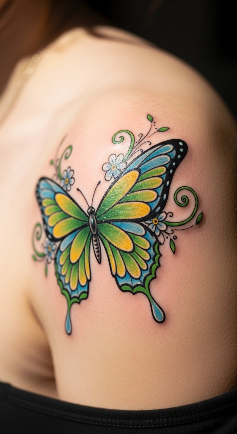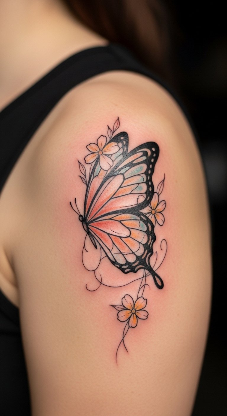 Butterfly tattoos with flowers create a garden on your shoulder. Combine wings and blooms for beauty. Sketch petals at home with colored pencils. Use garden photos for inspiration. Choose affordable flower elements to add. Position them along the curve for flow. Find artists who bundle designs cheaply. Test with floral stickers first. This combo means new beginnings. Keep it light for easy wear.