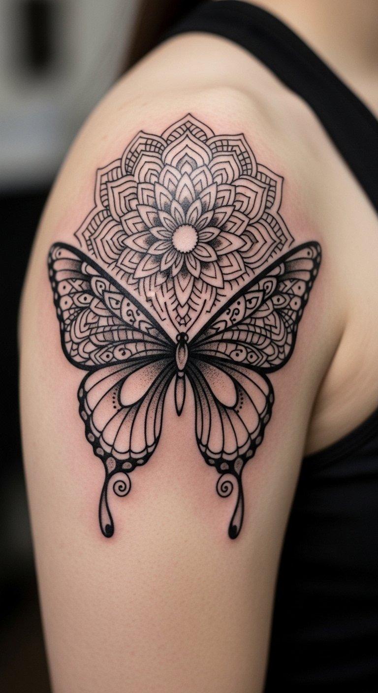 Butterfly and mandala tattoos merge circles and wings on your shoulder. They build a balanced design. Draw mandalas at home with a compass. Add butterfly shapes for fun. Opt for black ink to save money. Place it centrally for impact. Look for DIY kits online. This fusion shows inner peace. Try paper versions before ink. Keep details simple.