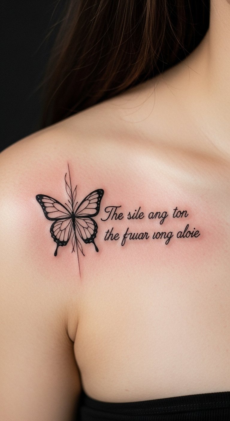 Butterfly tattoos with quotes add words to wings on your shoulder. Pick short phrases for impact. Write ideas in a notebook first. Use free fonts online for practice. Choose script that fits your budget. Position text below the butterfly. Find artists who engrave simply. This makes it personal. Test with temporary markers.