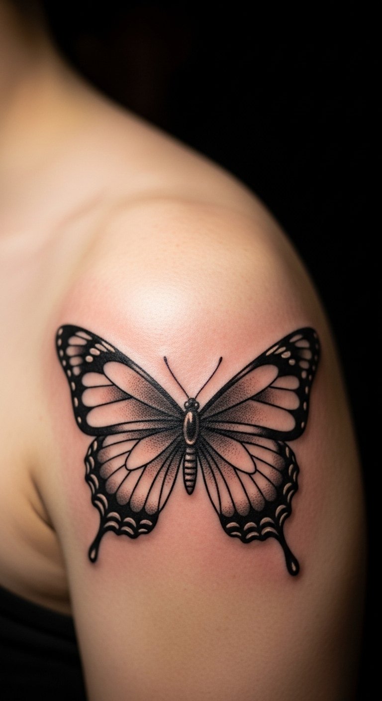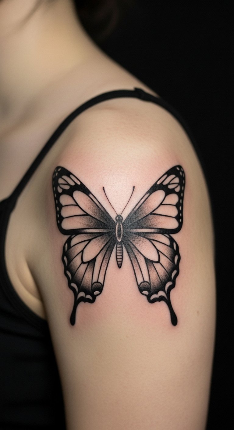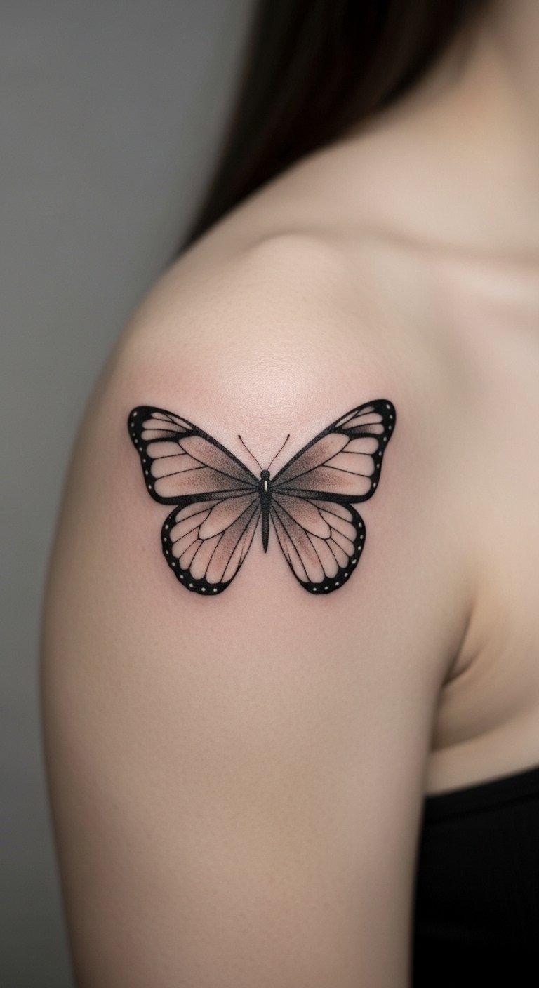 Timeless black and white butterfly tattoos last on your shoulder. Stick to shades. Draw in monochrome. Use basic pens. Place traditionally. This endures. Keep it classic.