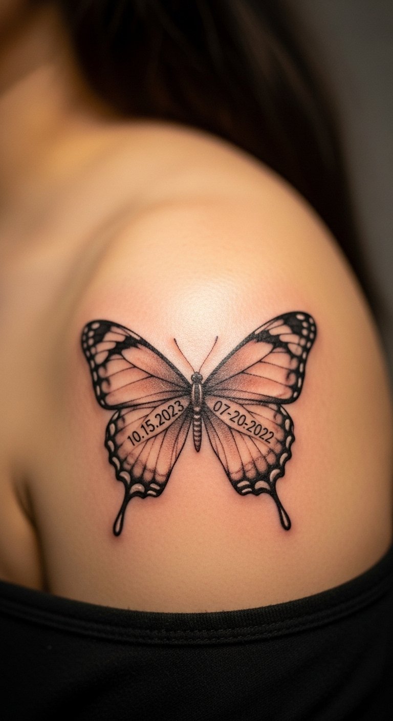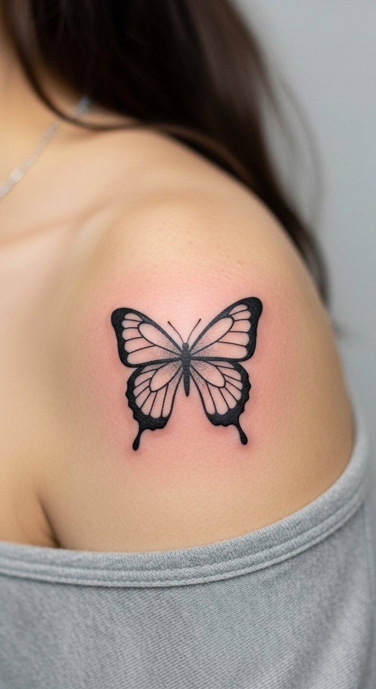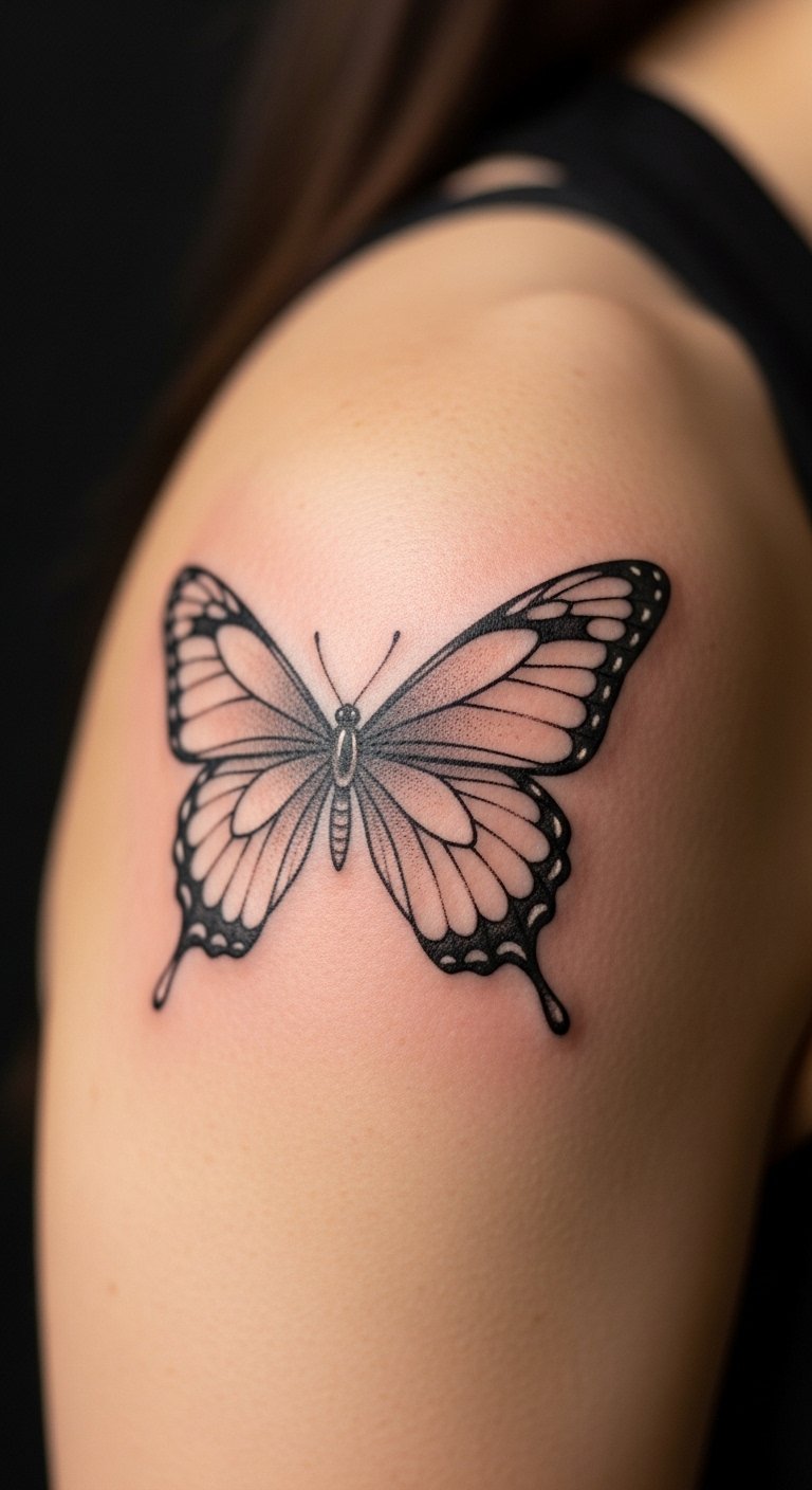 Timeless black and white butterfly tattoos last on your shoulder. Stick to shades. Draw in monochrome. Use basic pens. Place traditionally. This endures. Keep it classic.