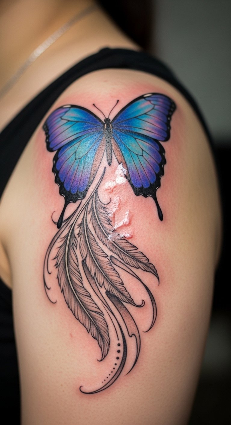 Healing butterfly tattoos with feathers show strength on your shoulder. Blend wings and plumes easily. Sketch feathers using everyday pens. Add them for a story. Opt for gray shades cheaply. Position along the edge. Find budget fusion ideas. This means recovery. Test drawings quickly.