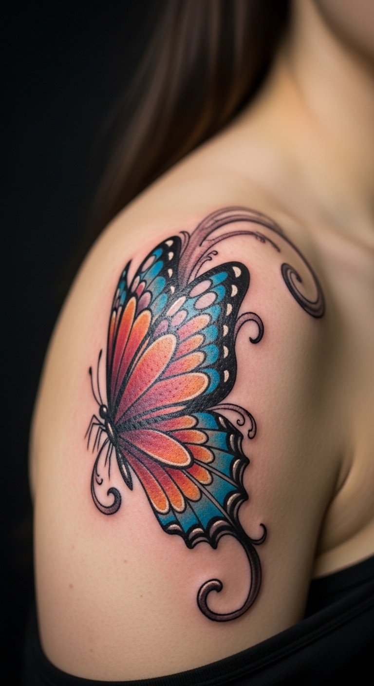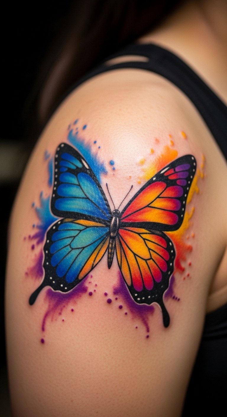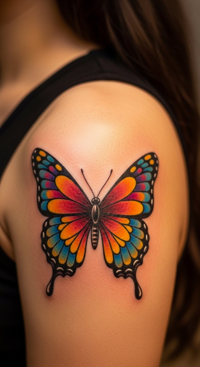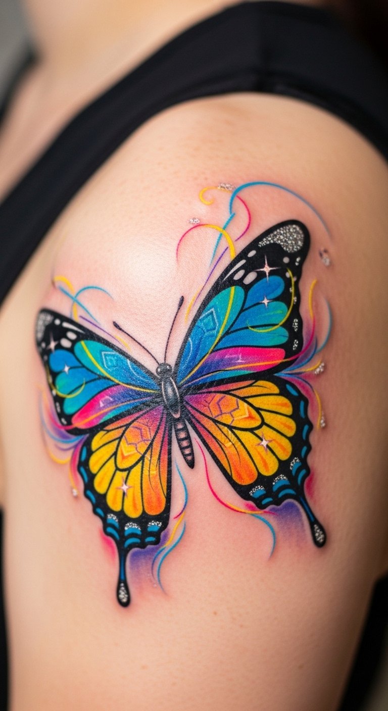 Low-maintenance colorful butterfly tattoos stay vibrant on your shoulder. Pick fade-friendly colors. Draw with ease. Use quality ink wisely. Position for care. This lasts. Moisturize regularly.