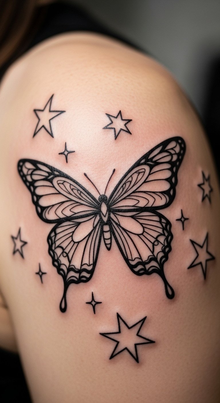 Customizable butterfly tattoos with stars adapt to you on your shoulder. Add stars easily. Sketch variations. Use star stickers. Make it yours. Find flexible artists. This personalizes. Adjust simply.