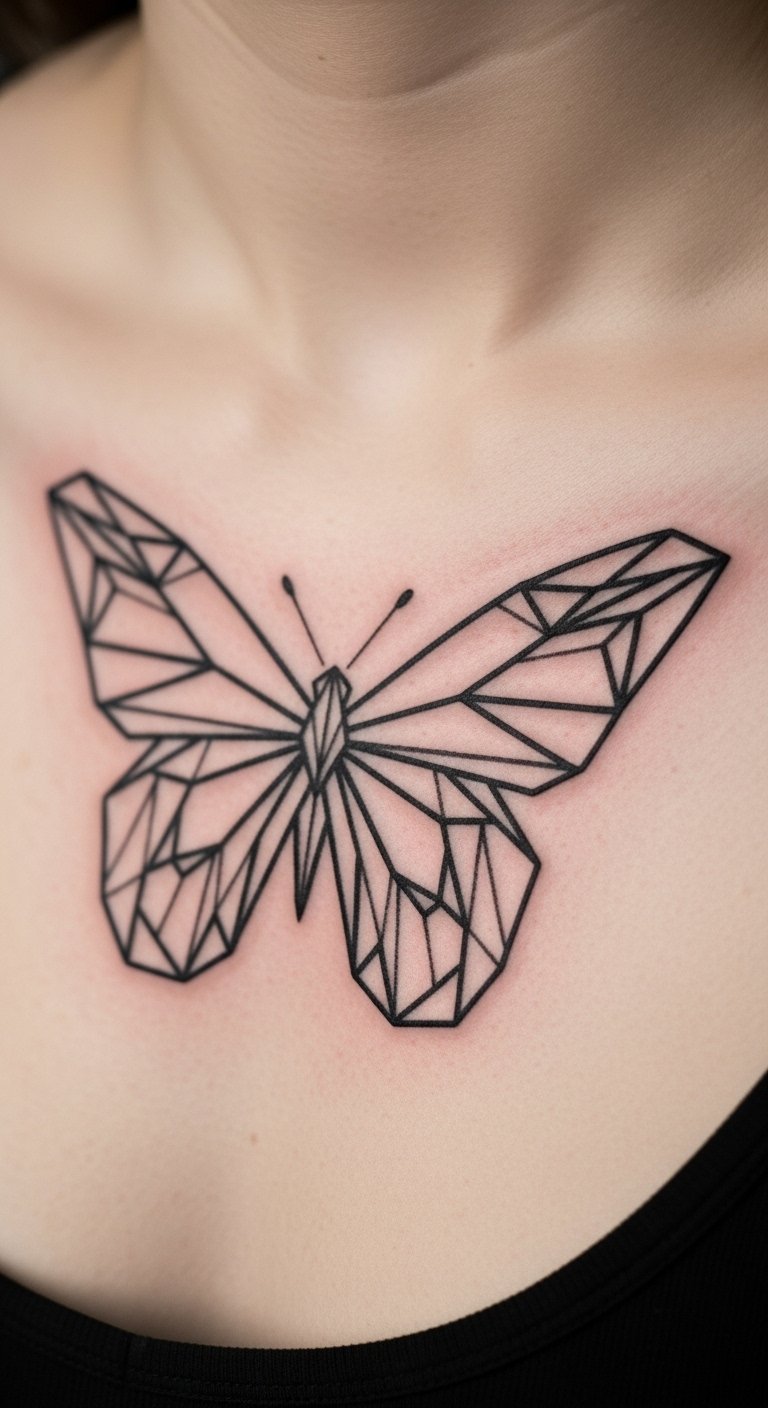 Geometric patterns turn a butterfly into a modern chest piece, using shapes for a structured look. Think triangles and lines forming wings. Draw grids on paper at home to experiment for free. Find budget artists who blend geometry with ease. Situate it across your chest for balance. Mix in personal symbols like stars. Use graph paper for DIY planning. Sharp angles hold up well with simple aftercare routines. Tip: wear loose shirts during healing to prevent rubbing. This design adds edge to your style. Start by tracing templates online and adjusting them yourself.