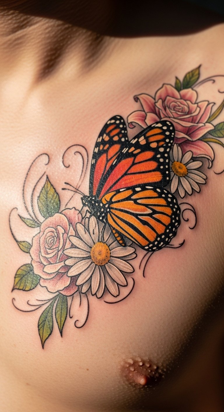 Pairing a butterfly with flowers on your chest creates a nature scene that’s full of life. Envision wings surrounded by blooms like roses. Draw combined sketches at home using colored markers for fun. Seek out affordable artists who do nature themes. Place it along your collarbone for flow. Include your favorite flower for a twist. Use garden photos as DIY references. Nature elements blend seamlessly with good care. Tip: use plant-based creams for soothing. This design feels fresh and personal. Start by arranging fake flowers on your chest to visualize.