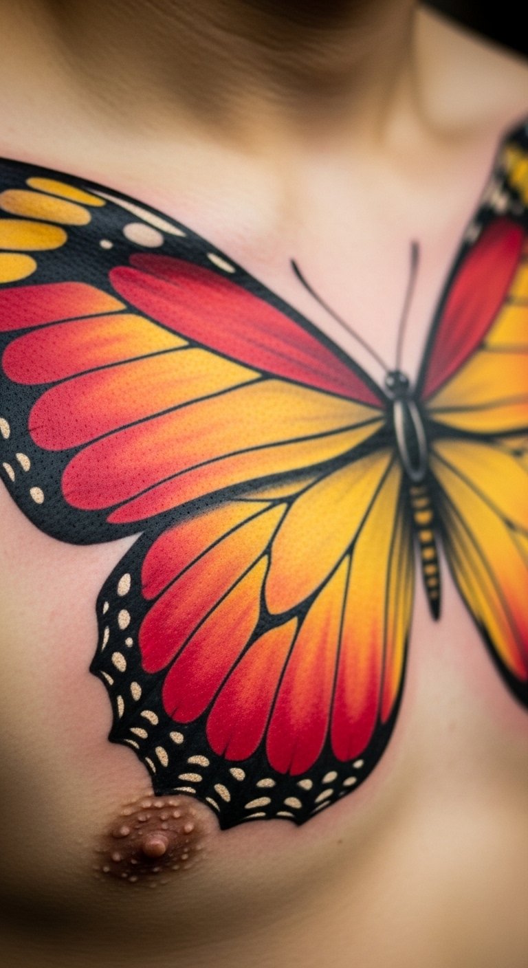A monarch butterfly on your chest celebrates migration and change with its striking colors. Think bright orange wings with black details. Practice drawing it on paper with crayons for a budget activity. Find artists offering colorful options at low rates. Position it prominently for visibility. Add migration-inspired elements. For home ideas, copy from butterfly books. Bright patterns retain color with sunscreen use. Simple step: heal with aloe from your kitchen. This tattoo tells a story. Get going by noting what the monarch means to you.