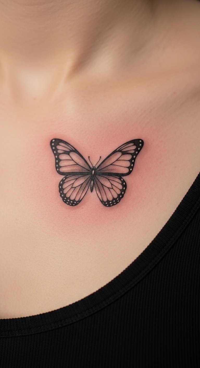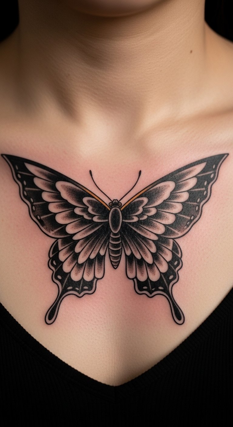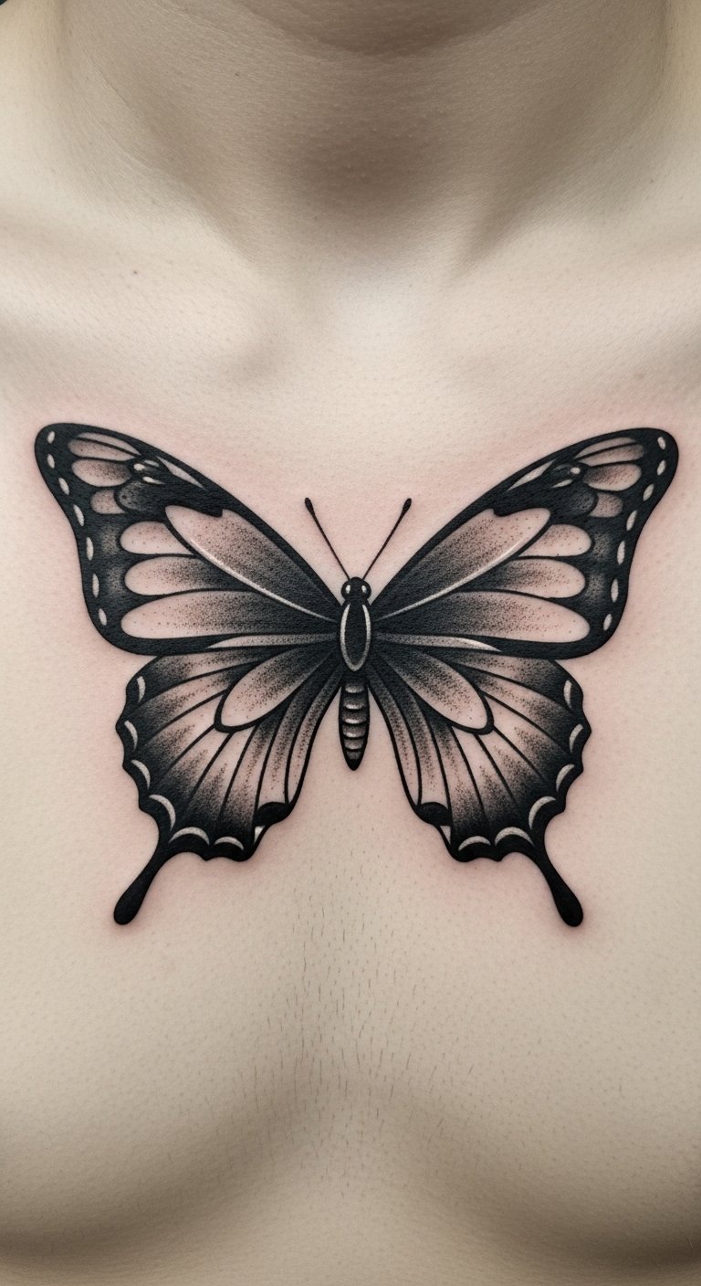 Black and grey keeps your chest butterfly timeless and classic. Think shaded tones. Draw in graphite at home. Find grey scale options affordably. Center for tradition. Add grey depths. Use pencil sets for ideas. Shaded tones endure. Tip: regular checks. This design lasts. Start with grey sketches.