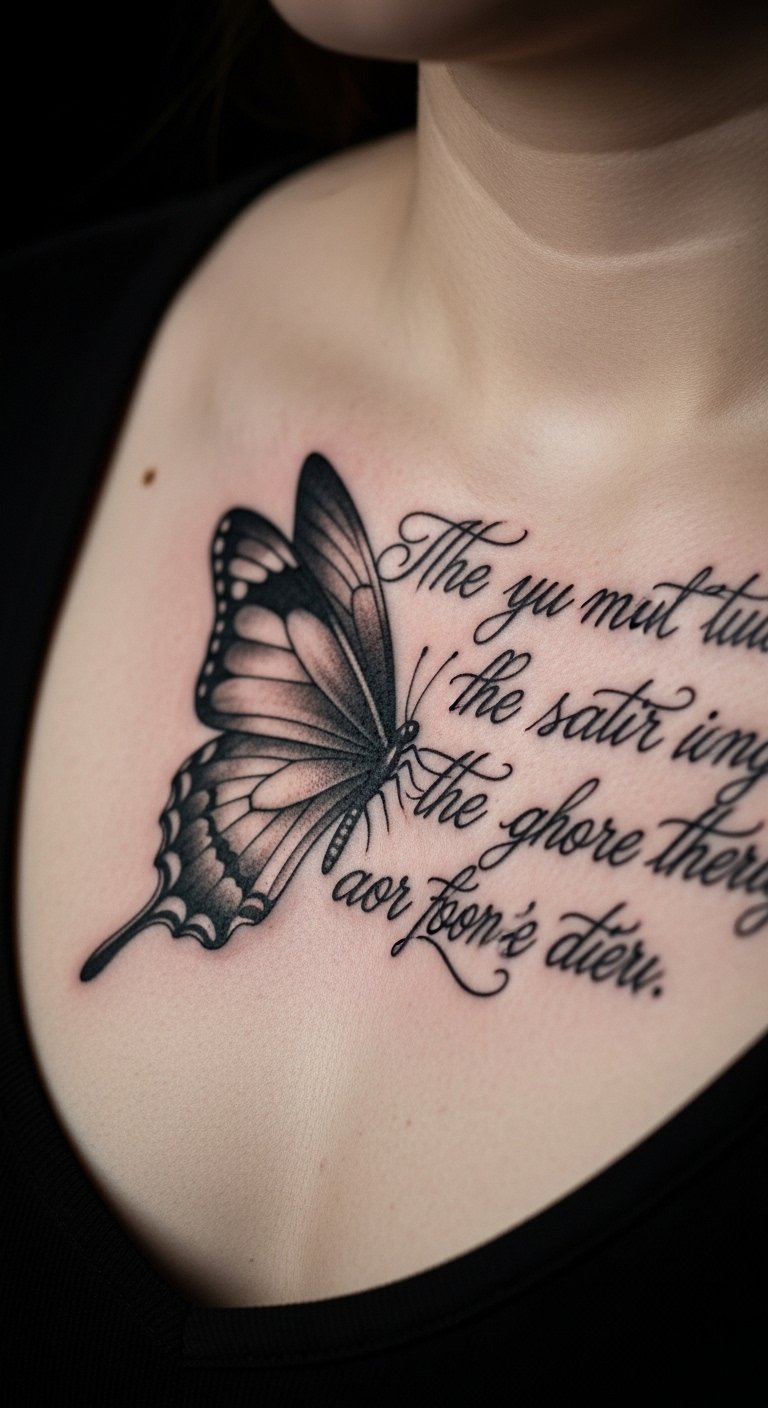 Combining a butterfly with a quote on your chest adds words to the wings for extra meaning. Think a short phrase next to the design. Write quotes on paper with the butterfly for cheap planning. Seek artists who add text economically. Position text below the wings. Choose quotes that matter. Use notebooks for brainstorming. Meaningful words integrate smoothly. Tip: keep it short for clarity. This combo inspires. Begin by jotting down ideas.