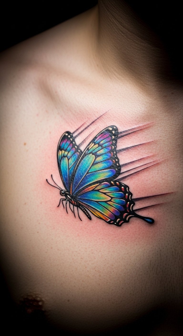Butterfly in flight suggests movement on your chest, like it’s taking off. Picture extended wings with lines. Draw motion sketches on paper quickly. Look for dynamic artists on a budget. Center it for drama. Include wind effects. Use action photos for ideas. Motion lines add energy. Tip: protect from wear. This tattoo motivates. Begin with simple drawings.