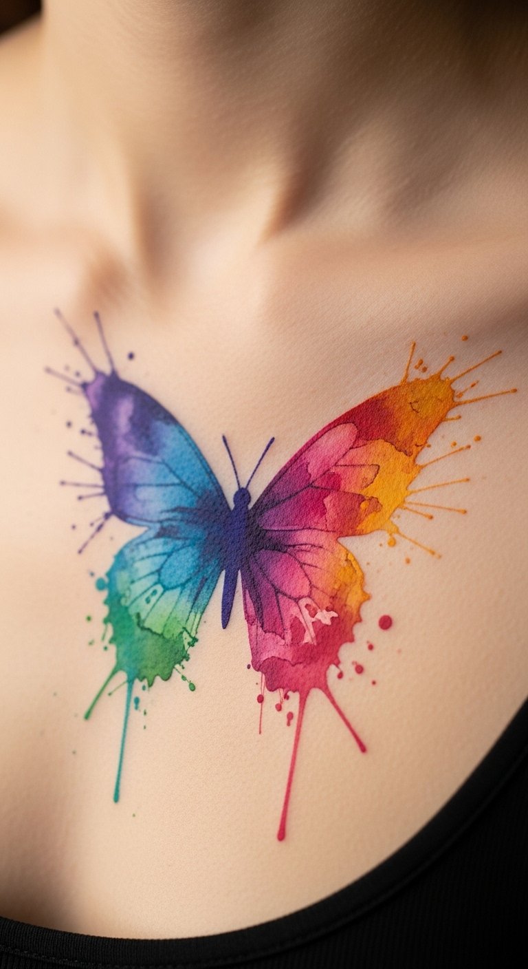 Watercolor splashes give your chest butterfly a playful, blended look. Envision colors merging. Experiment with watercolors at home. Search for splash specialists cheaply. Arrange for visual flow. Mix splash with shapes. Use kid’s paints for testing. Blended colors charm easily. Tip: seal with cream. This design is fun. Begin with color play.