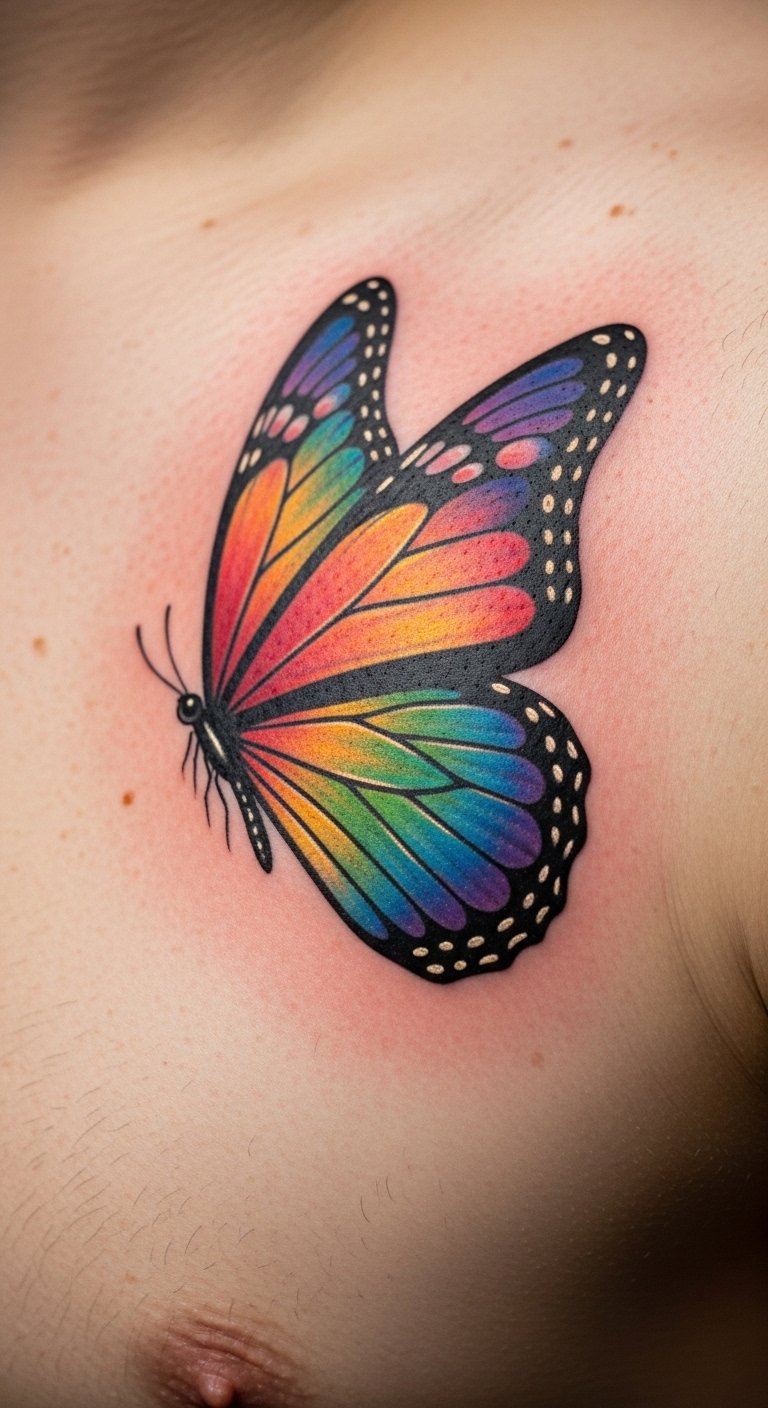 Rainbow colors make your chest butterfly a festival of hues. Envision every shade. Color wheel at home for fun. Search for rainbow deals. Arc it across. Include pride elements. Use rainbow tools for prep. Spectrum colors joyfully pop. Tip: color-safe products. This design celebrates. Begin with rainbow art.