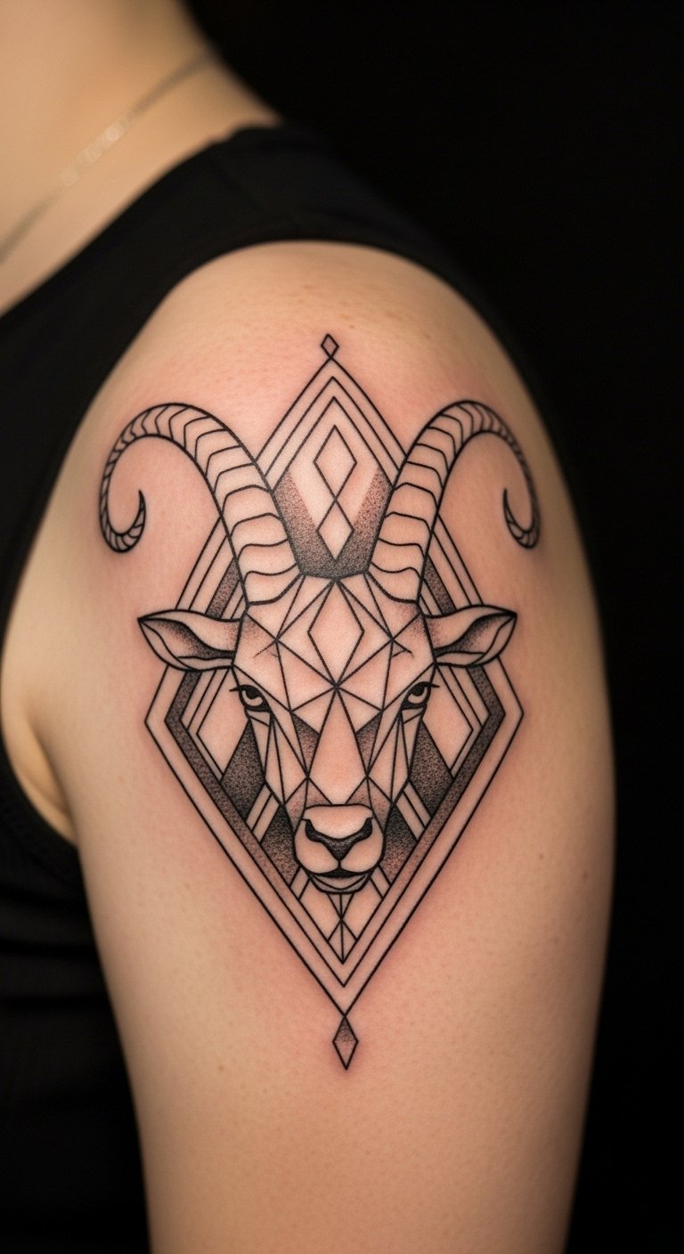 Geometric Capricorn Tattoo with Diamonds