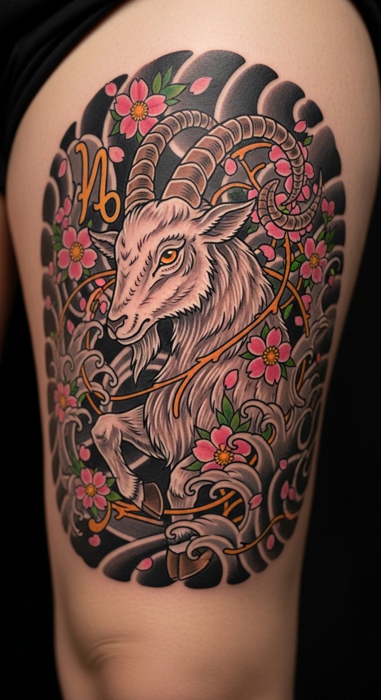 Japanese Style Capricorn Tattoo with Cherry Blossoms