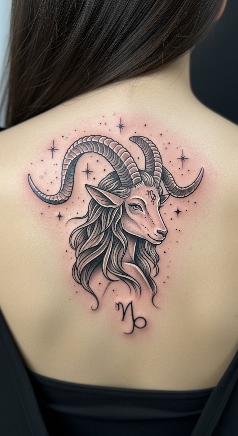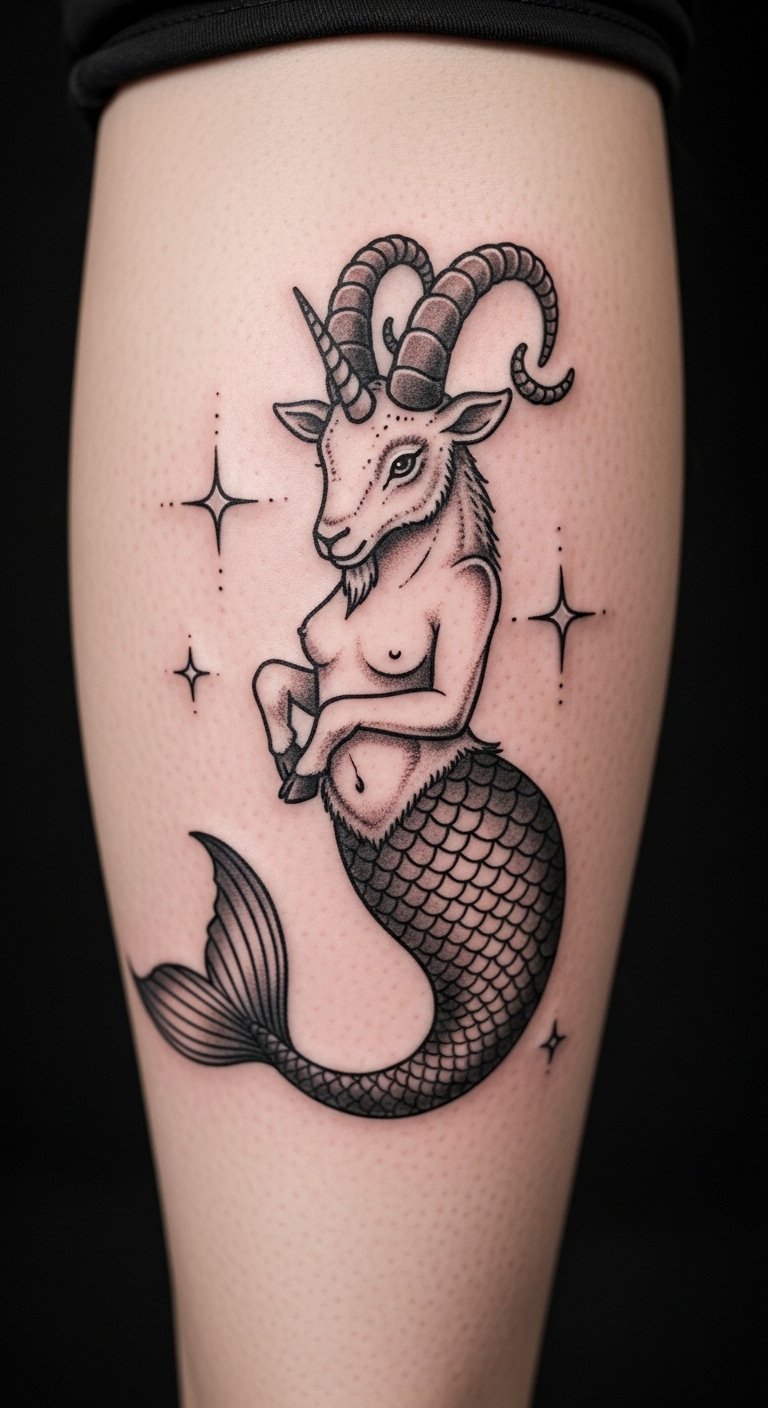 Give it a graceful spin. This design turns the Capricorn goat into a woman with horns for a feminine touch. Draw inspiration from simple sketches using free online templates. Add flowing elements like hair with a basic brush at home. Use makeup pencils to test the look on your arm—costs pennies. Place it on your thigh for a personal statement. Mix in natural motifs for softness. Practice with fabric paints on a scarf to see how it flows. This tattoo celebrates balance and charm. Keep curves gentle and bold. A DIY mirror reflection can fine-tune the details. The final piece feels empowering and fresh.