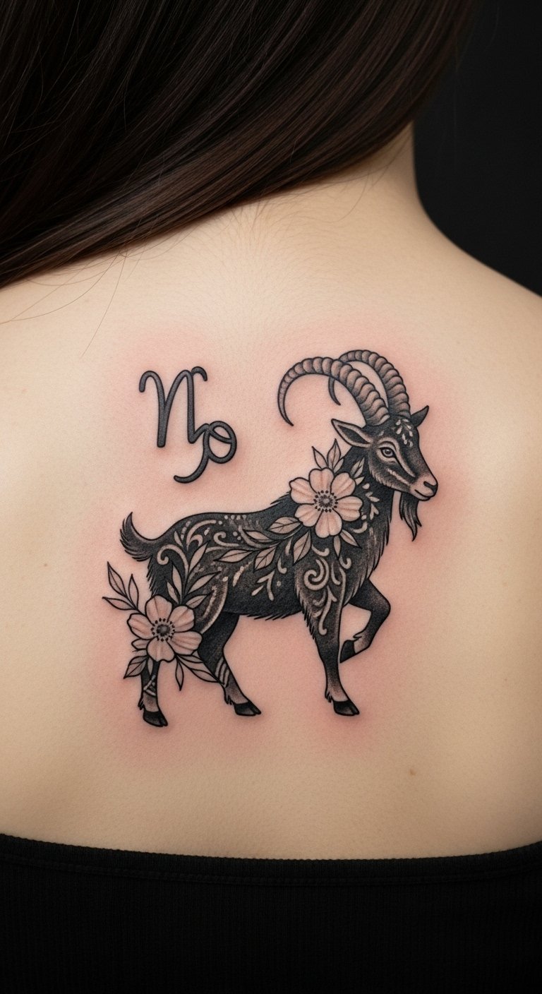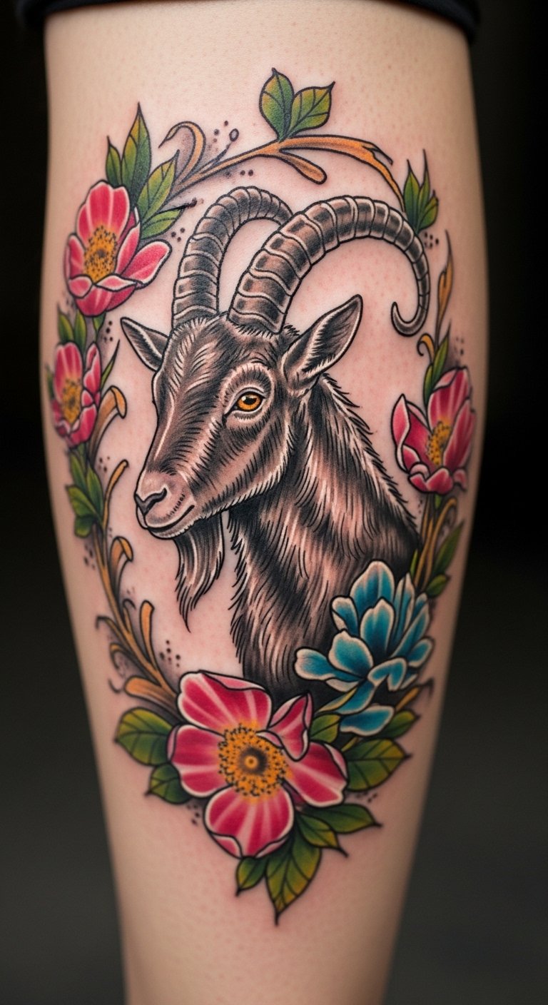 Nature Motifs Capricorn Tattoo with Flowers