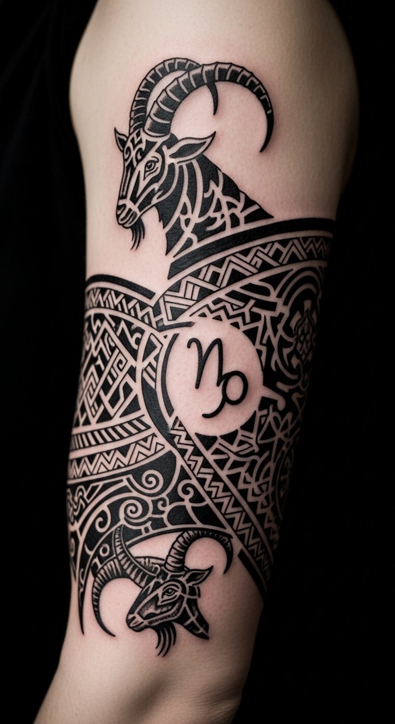 Tribal lines bring bold energy. Combine Capricorn with patterned weaves for a strong look. Draw tribal shapes on paper with a marker set. Integrate the goat into the flows. Use tape to outline on your body for practice. Place it on your chest for presence. Mix in simple knots for texture. Cardboard cutouts can create stencils at home. This tattoo conveys resilience. Keep patterns connected but not overwhelming. Temporary tribal stickers offer a low-cost trial. The design stands as a symbol of strength.