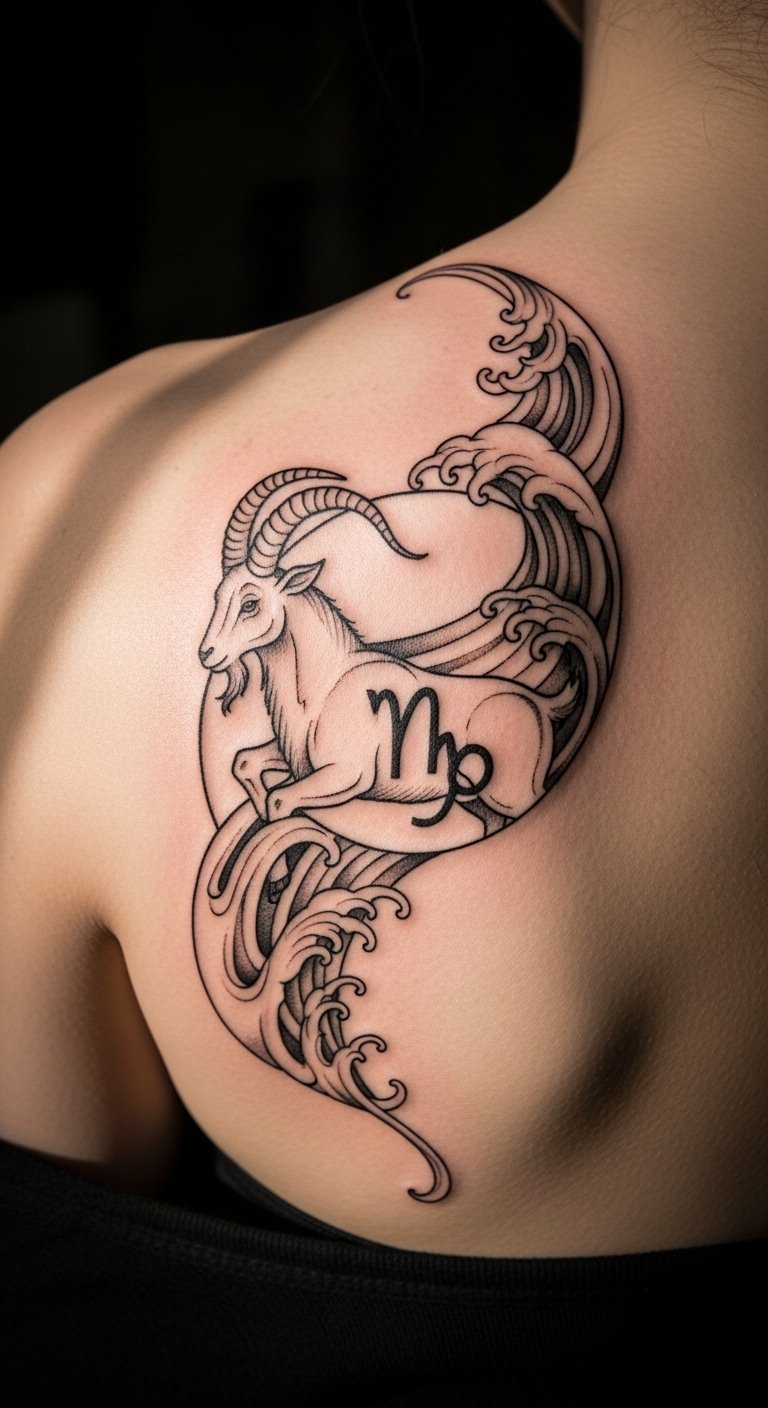 Merge cultures for a unique twist. This design combines the Capricorn goat with cherry blossoms and waves for a vibrant feel. Sketch the elements on paper with colored pencils—grab a set for less than $15. Add blossoms around the goat to soften the edges. Use fabric markers on a pillowcase to practice blending patterns at home. Place it on your shoulder for a balanced view. If colors appeal, mix in water-based paints for a DIY stamp. This tattoo tells a story of strength and beauty. Keep the waves simple to avoid clutter. Test with temporary stencils from online prints—often free to download. The result brings tradition to life affordably.