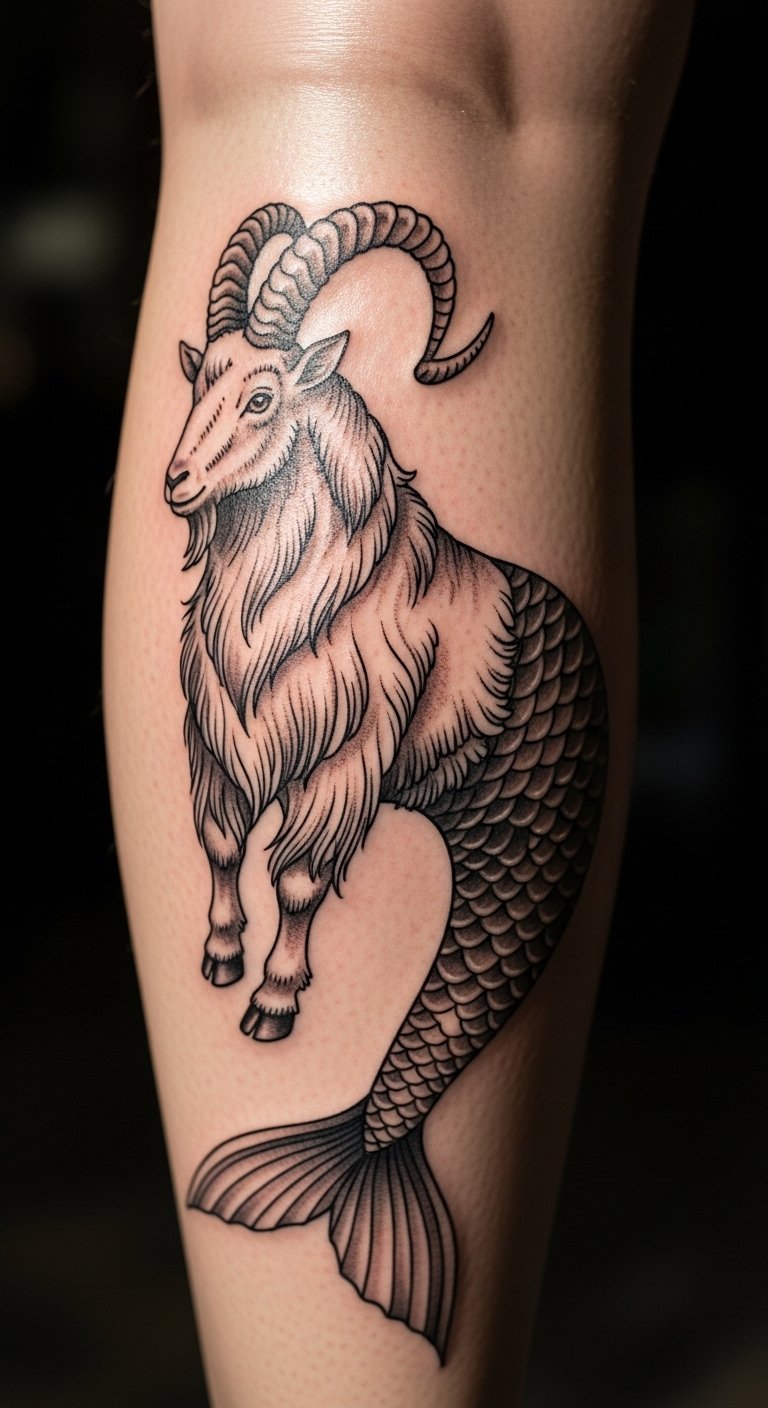 Mythology adds wonder. This sea goat design mixes fish and goat for a story. Sketch the hybrid on paper with pencils. Add scales using dot patterns. Use shells to inspire shapes at home. Position it on your arm for storytelling. Practice with clay models for depth. This tattoo sparks imagination. Keep details focused. Temporary designs let you try it out.