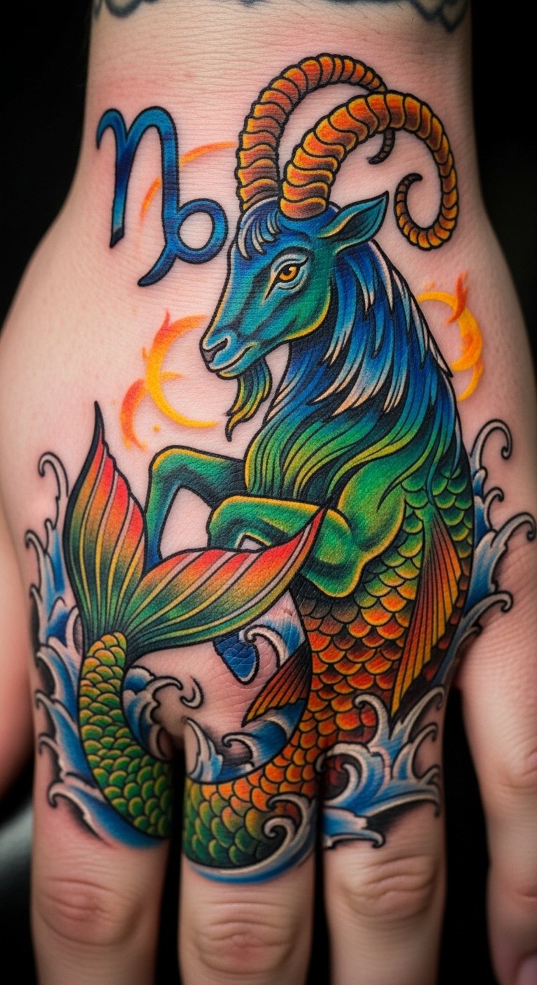 Colors make it vibrant. Use hues on the Capricorn goat for a lively effect. Mix paints at home for samples. Start with primary shades. Put it on your wrist for pop. Crayons work for previews. This tattoo energizes your look. Keep colors bold. Stickers test the scheme.