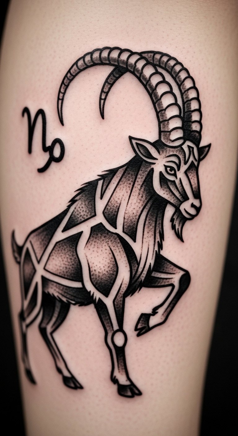 Dive into a design that uses diamonds for a modern edge. Geometric Capricorn tattoos blend shapes like diamonds with the classic goat symbol. This creates a clean, structured look that echoes Capricorn traits. Start simple with a sketch on paper using a basic pen. For a budget option, trace diamond patterns from online freehand tutorials. Add the goat outline yourself. Think about using henna as a temporary test—costs under $10 and washes off easy. Pair it with other shapes for balance. Keep lines bold yet simple. This approach fits anyone seeking subtlety without a big commitment. Experiment at home with free apps for digital mockups. The result? A tattoo that feels personal and strong.