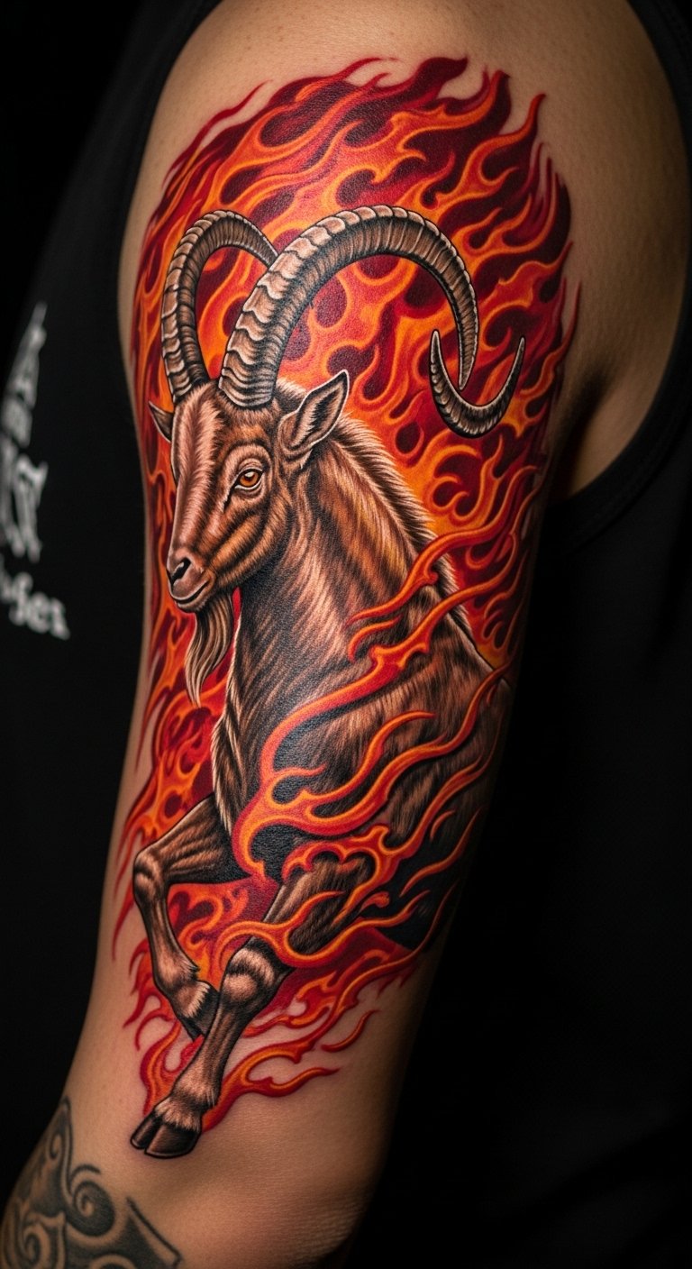 Flames and Capricorn Fusion Tattoo