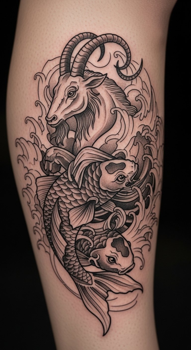 Koi Fish and Capricorn Mix Tattoo