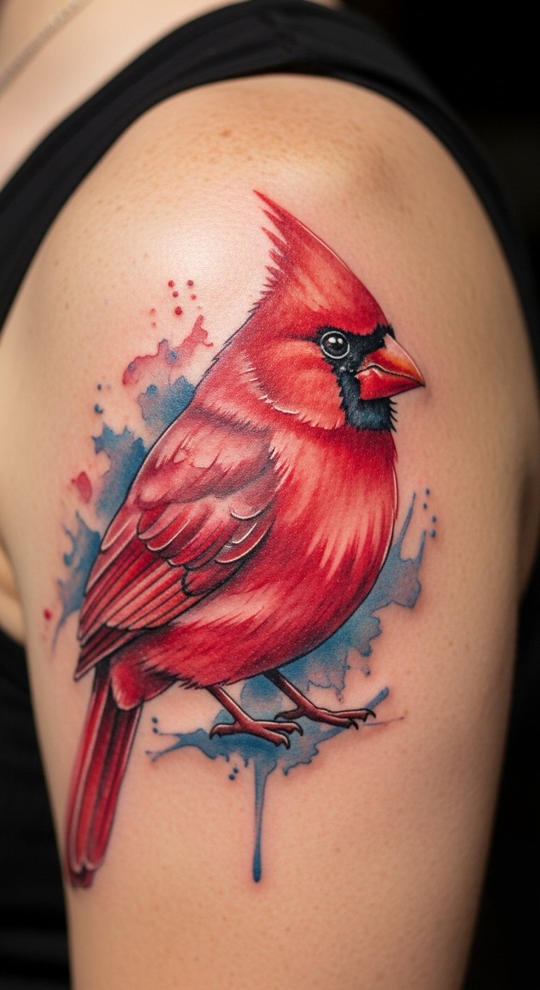 Watercolor cardinals use soft colors for a painted feel. Mix watercolors at home to practice on paper first. Choose affordable red shades from craft stores. Place it on your arm for daily visibility. A small version costs less than detailed ones. Layer colors slowly for that blurry effect. Find tutorials online to try blending yourself. This method adds fun without breaking the bank. Get feedback from friends on your sketch before going pro.