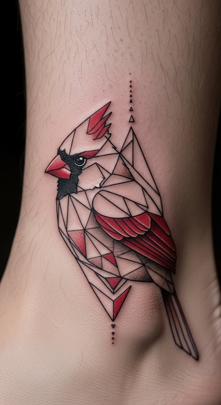 Geometric cardinals mix shapes for a modern vibe. Use a ruler and paper to draw triangles around a bird outline at home. Keep it symmetric for balance. Opt for a tiny design on your ankle to cut costs. Free apps help create patterns on your phone. Add simple dots for extra flair. This style fits small budgets and quick sessions. Practice with markers before booking an artist. It makes your tattoo stand out easily.