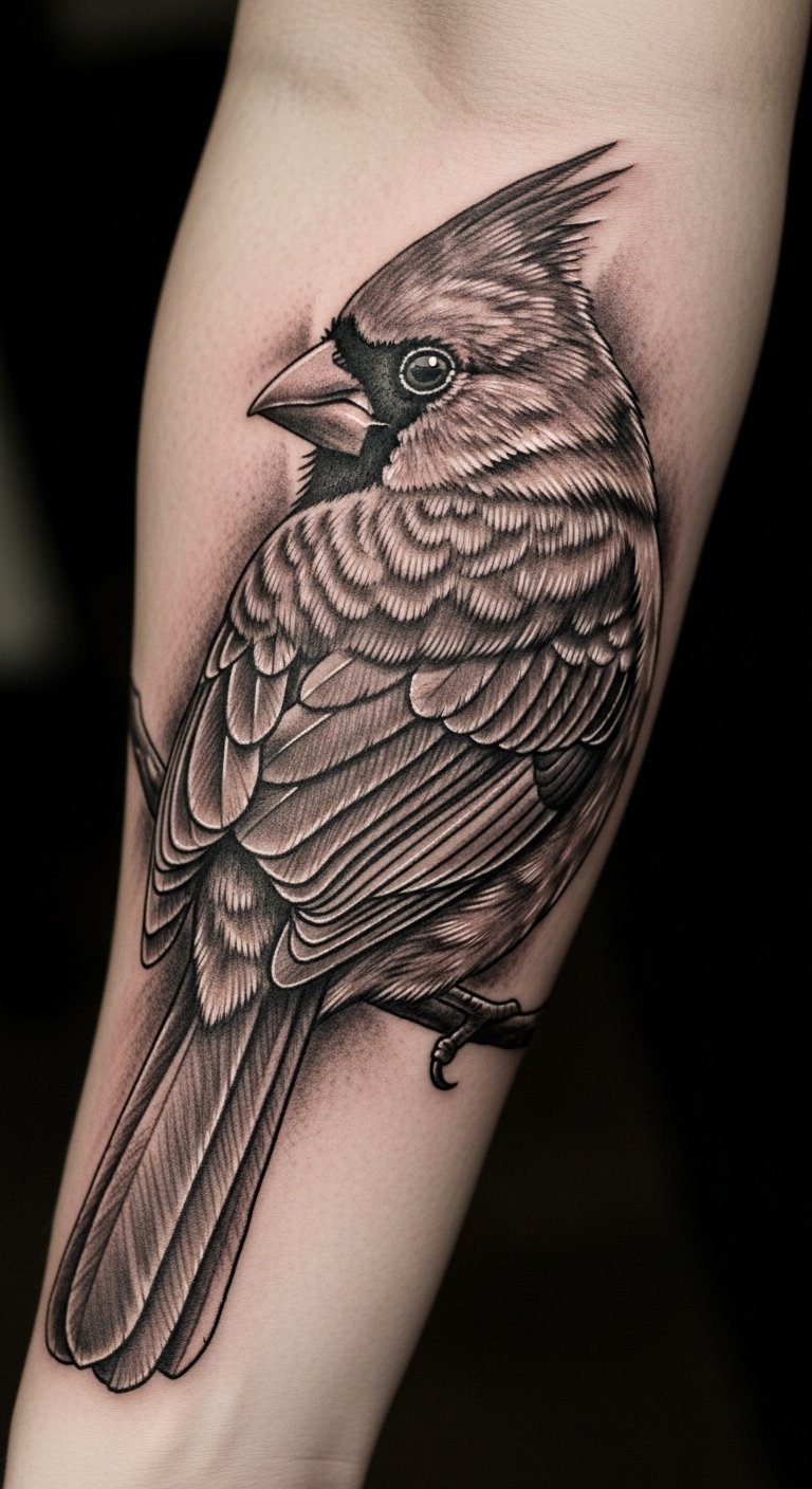 Black and grey cardinals offer timeless appeal. Use graphite pencils to draw on paper at home. Stick to shades of grey for simplicity. Place it on your arm for easy viewing. Download free templates to practice. This style avoids color fees. Add light shadows for depth without extras. It makes a strong statement affordably. Check local shops for deals on grey ink.