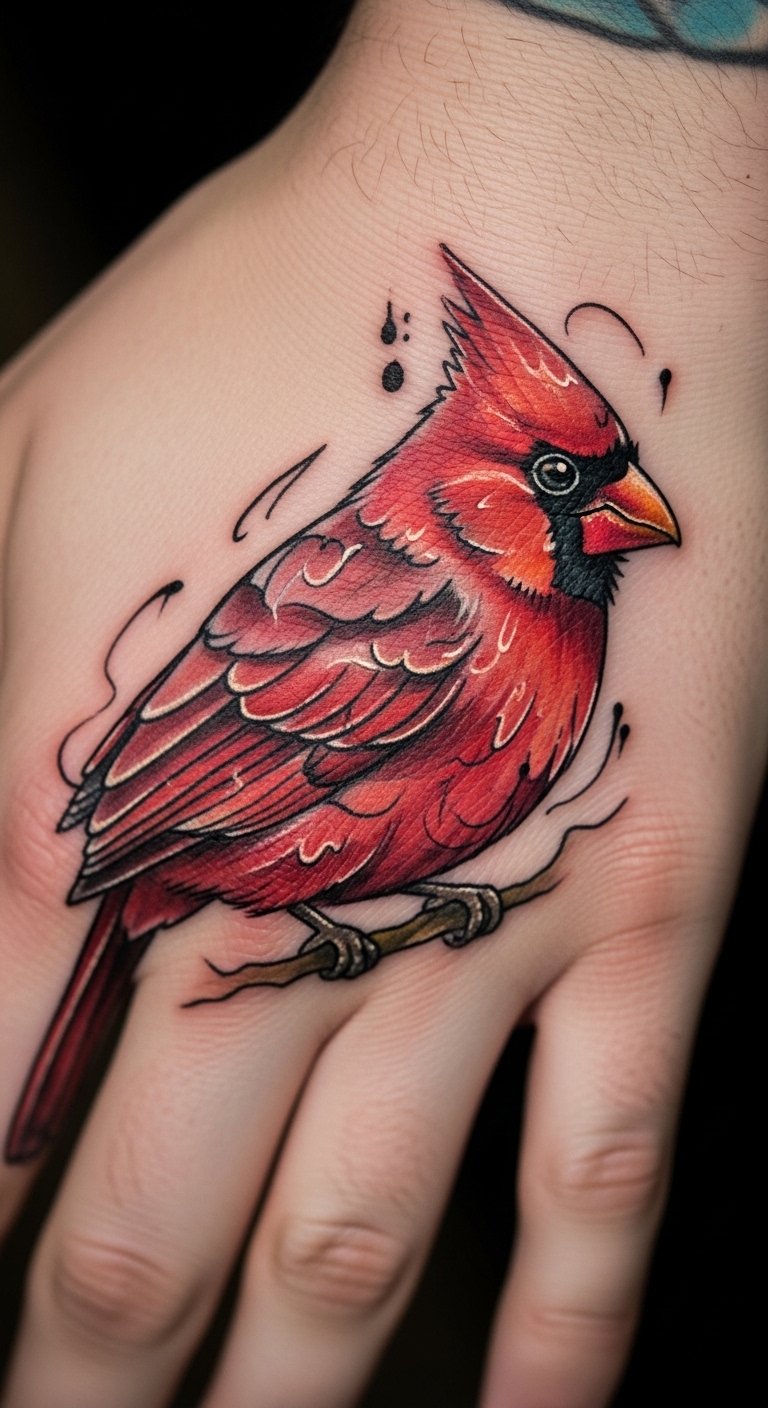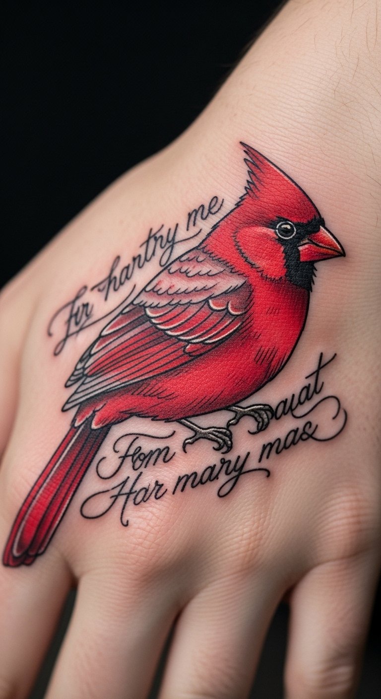 Script with cardinals adds names or words. Write your text next to the bird on paper. Keep fonts simple to cut complexity. Put it on your hand for daily reminders. Use free fonts online for sketches. A basic add-on saves money. Practice writing with pens at home. This personalizes your tattoo easily. Opt for a budget artist who handles text well.