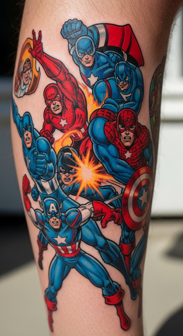 Think of Iron Man in full color on your skin. This tattoo brings superheroes to life with reds and blues. Draw your favorite character on paper first. Find an affordable artist through reviews. Use sticker tattoos to try it out for $5. Snap photos to see how it looks. Place it on your back for a big impact. Mix in elements like shields for fun. Protect it from sun with cheap covers. Sketch ideas with kids’ coloring books. Join community forums for tips. Create a hero that fits your life. Keep designs simple for less pain. Experiment with colors using markers. Have a blast with this choice.