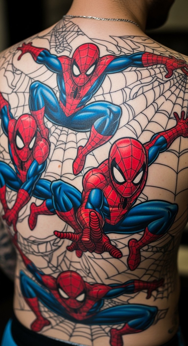 Watch Spider-Man swing across your back. This design pops with webs and reds. Map it out on a drawing pad. Check for affordable sessions online. Get fake tattoos to test for cheap. Upload designs to social feeds. Position on shoulders for action. Mix in cityscapes for fun. Use scarves to shield from sun. Sketch with free software. Engage with comic lovers. Make it your adventure story. Pick medium sizes for balance. Experiment with stamps. Enjoy the thrill it adds.