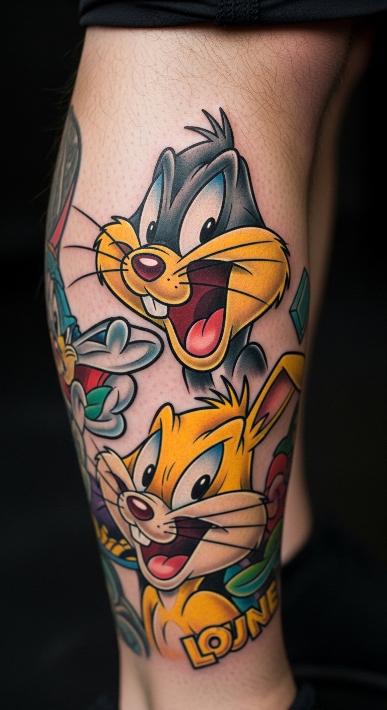 Bugs Bunny in wild colors on your leg. This tattoo mixes yellows and greens for laughs. Draw rough ideas first. Look at local deals for artists. Try budget temporaries online. Show your picks to pals. Put it on legs for movement. Add carrots for character. Keep it safe with covers. Use kid’s crayons for practice. Talk in fun forums. Create chaos that suits you. Go small to stay affordable. Test with face paints. Have fun with the vibe.