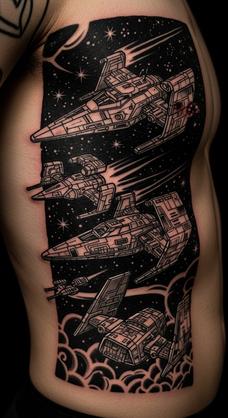 A Millennium Falcon on your ribs tells a tale. This design uses blacks for space vibes. Plan with a quick note. Find cost-effective artists. Use cheap transfers to preview. Post on platforms for feedback. Wear on sides for privacy. Include lasers for excitement. Guard with clothing. Draw with basic tools. Chat in fan groups. Build a scene that inspires. Choose outlines to save. Try with markers. Dive into the galaxy.