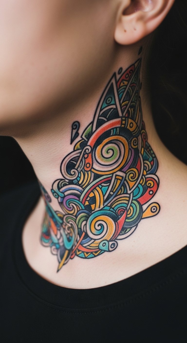 Swirly shapes from cartoons on your neck. This design blends forms creatively. Jot ideas down fast. Look for budget options. Get trial stickers. Display online. Put on neck for style. Mix elements freely. Cover as needed. Draw freely. Connect with creators. Form your abstract. Keep costs low. Use paints for tests. Explore the art.
