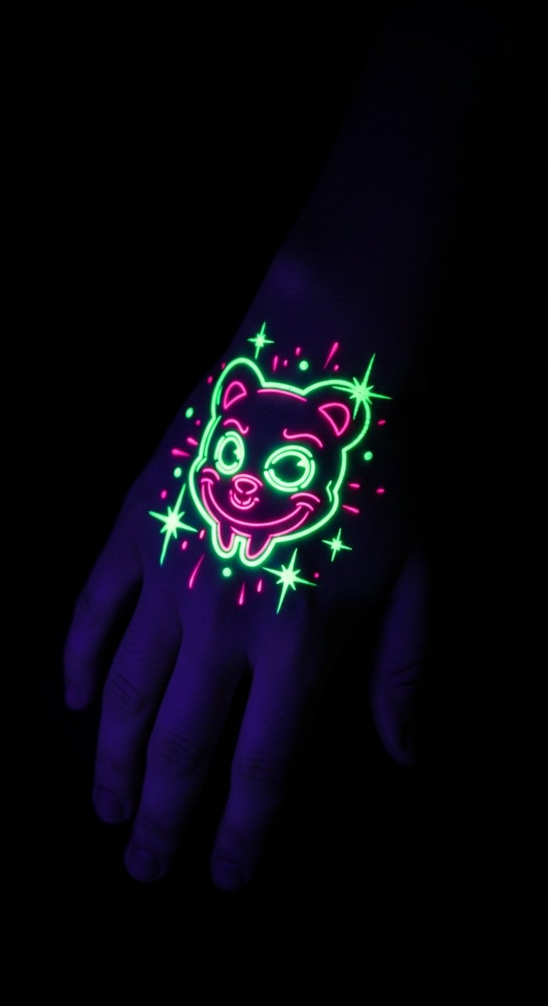 Stars that glow on your hand. This tattoo shines in the dark. Outline on paper. Seek value artists. Use glow stickers. Show in posts. Put on hands for glow. Include planets. Protect from light. Draw with glow pens. Join night groups. Light up your night. Keep it cheap. Experiment indoors. See the magic.