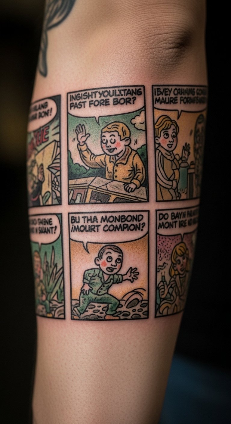 Old comic panels on your arm. This design mimics strips. Note ideas. Find deals. Try paper versions. Upload shares. Wear on arms. Add speech bubbles. Care for ink. Sketch old ways. Chat in circles. Strip your story. Save money. Use old books. Relive the past.